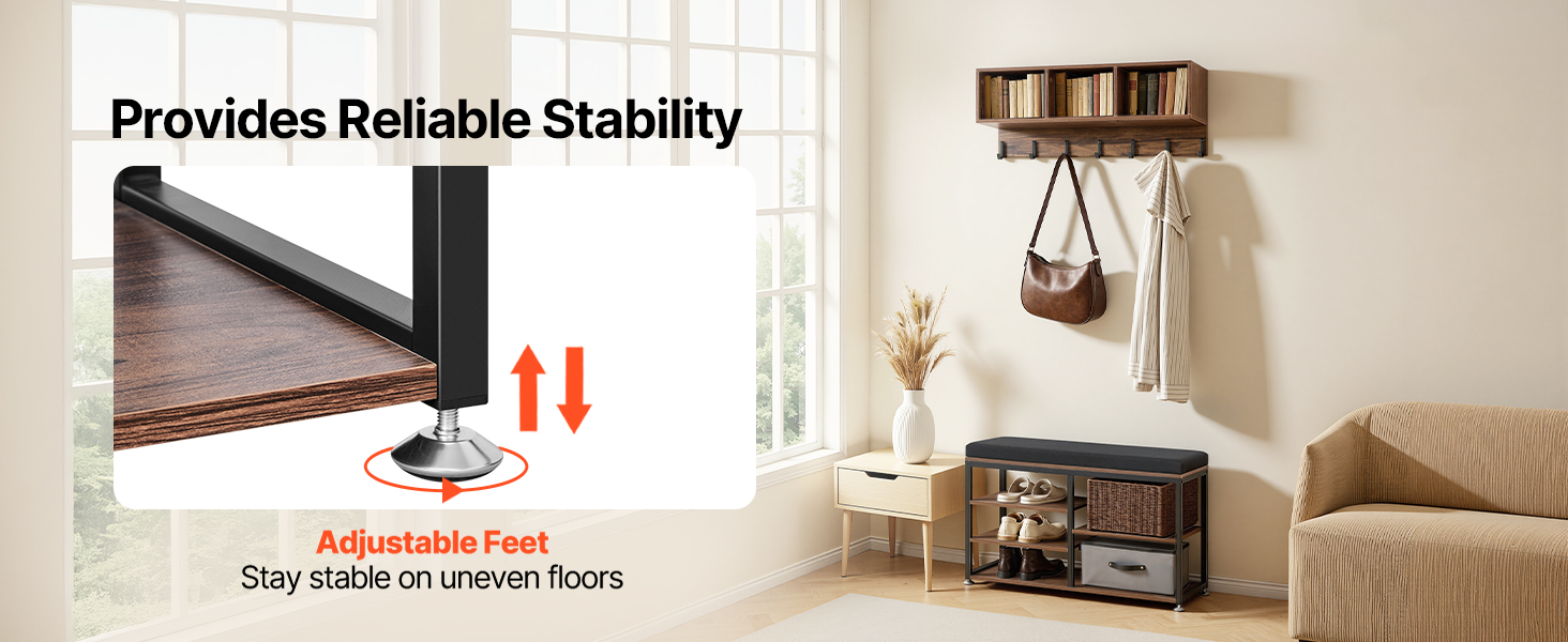 Nástenné protisklzové pásky a nastaviteľné nožičky tohto vešiaka na kabáty a topánky spoločne zvyšujú stabilitu a pomáhajú udržiavať bezpečný a pohodlný domáci priestor pre celú rodinu.