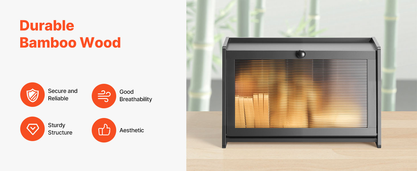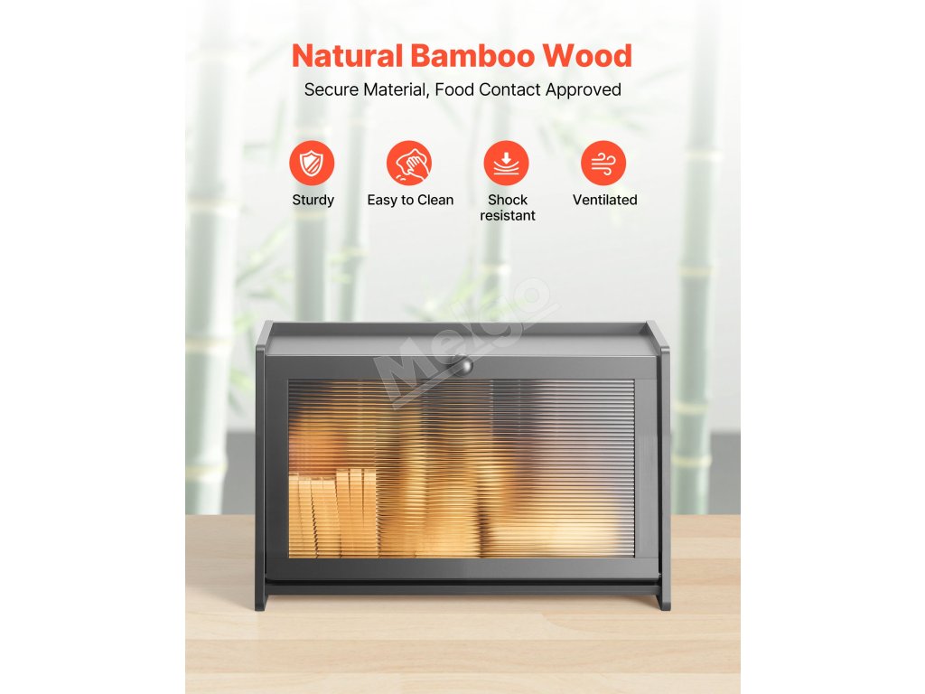 Tento drevený box na chlieb je vyrobený z prírodného bambusu a je spoľahlivý a odolný. Vetracie otvory v zadnej časti zlepšujú prúdenie vzduchu, čím predlžujú čerstvosť chleba a udržiavajú ho dlhšie chutný.
