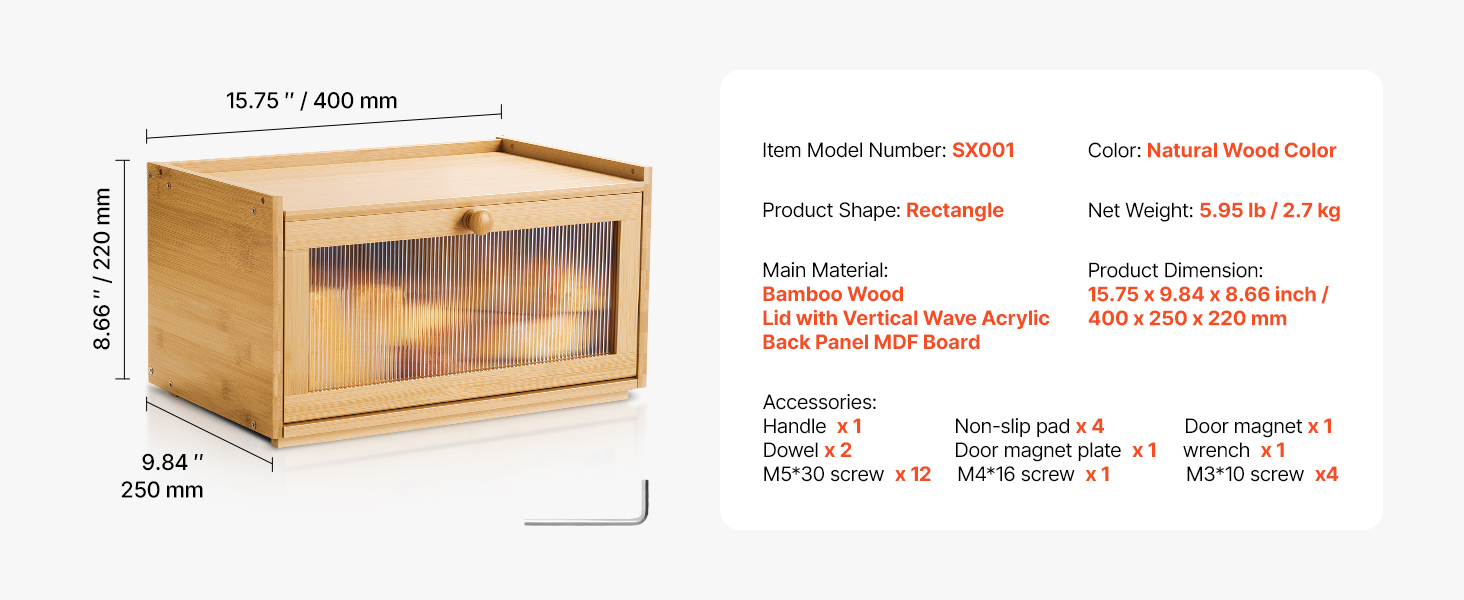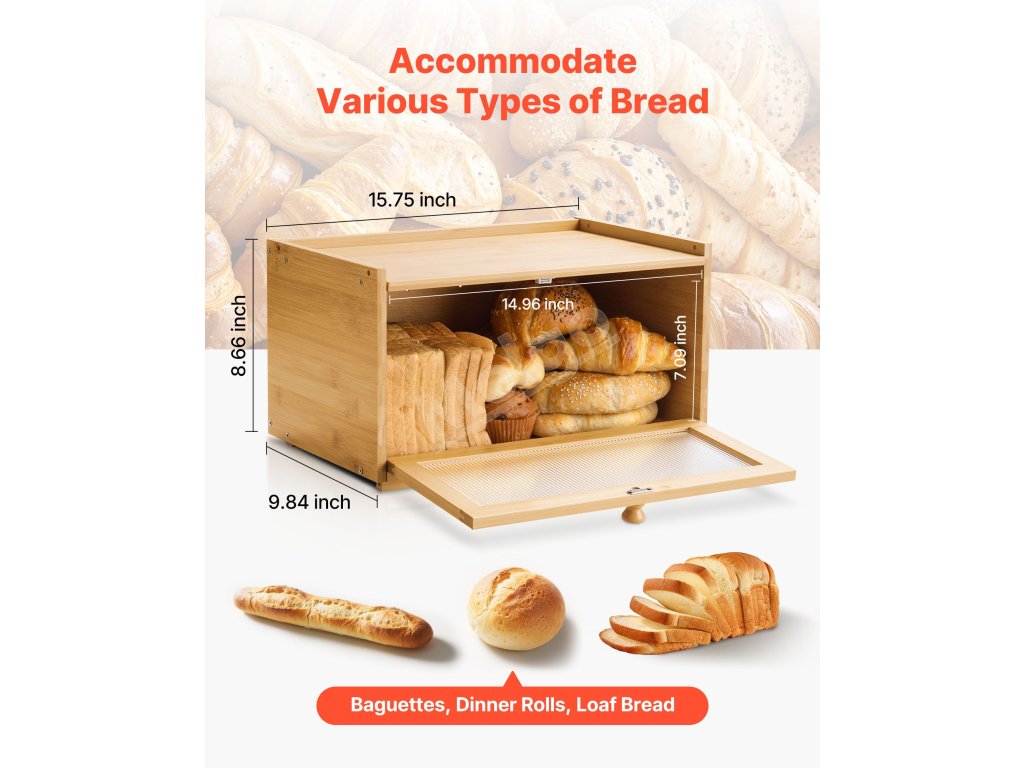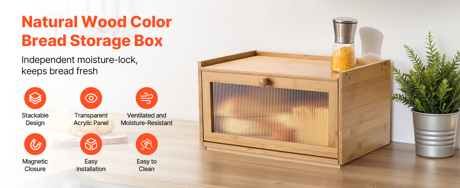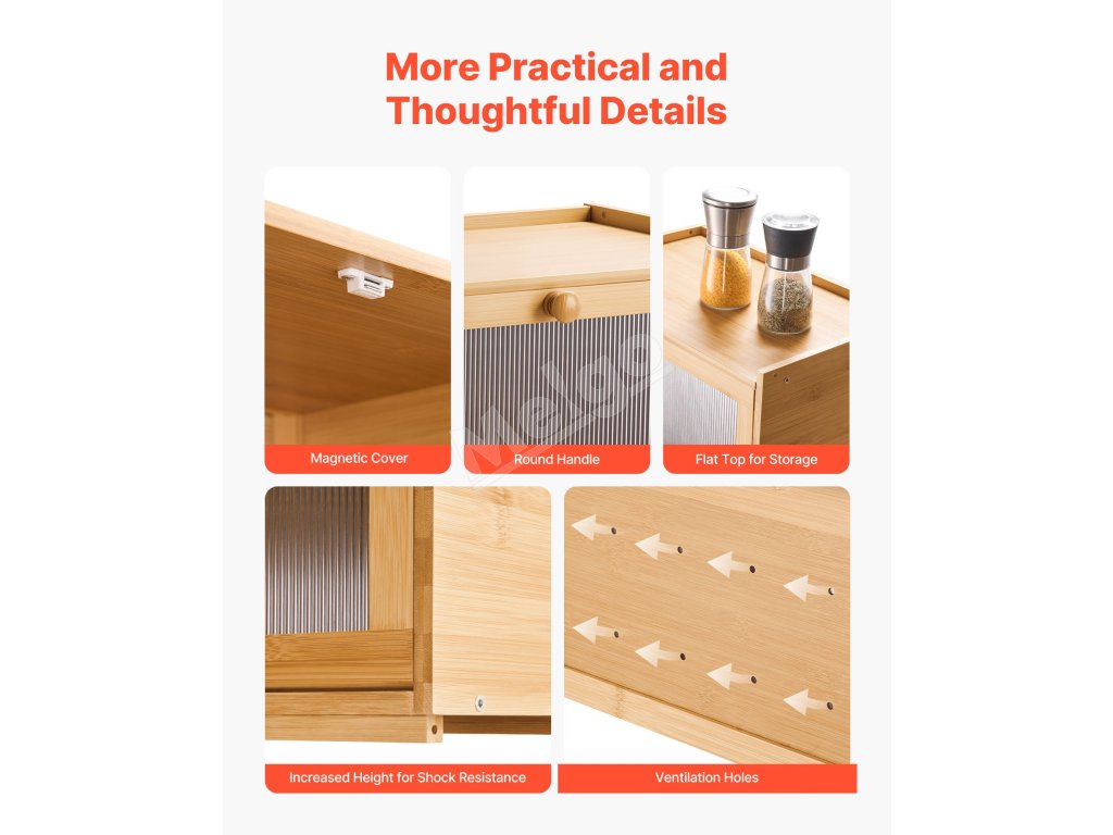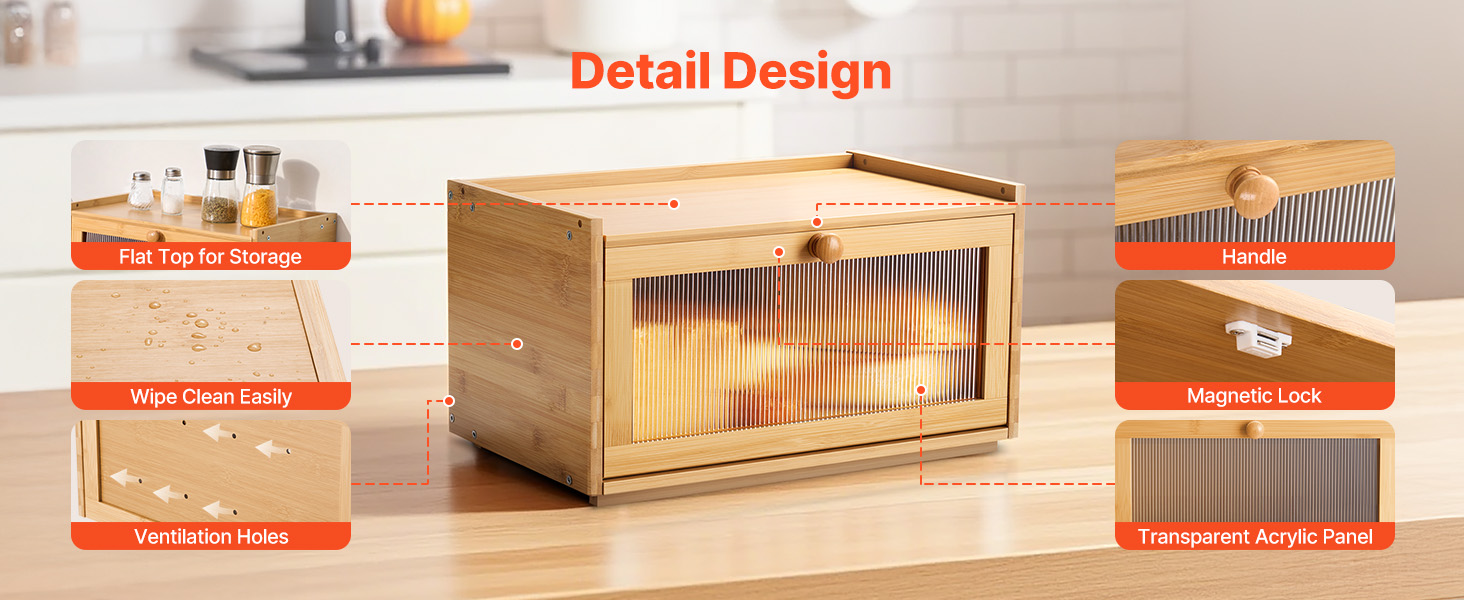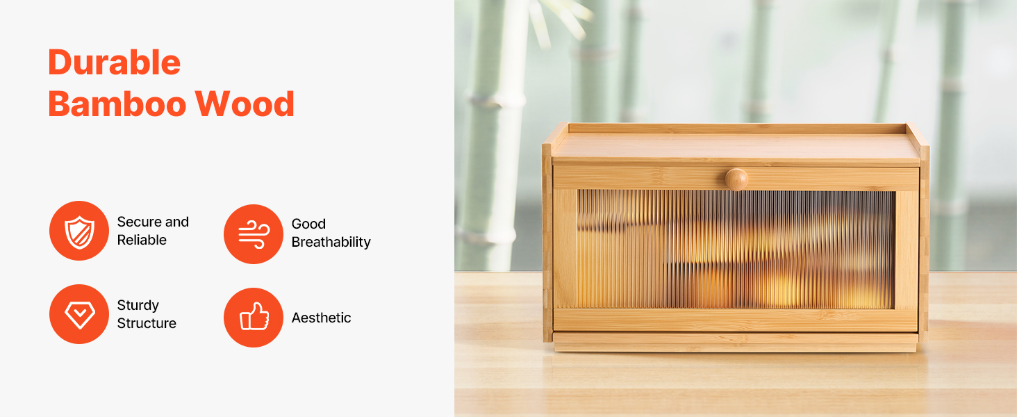 Tento drevený box na chlieb je vyrobený z prírodného bambusu a je spoľahlivý a odolný. Vetracie otvory v zadnej časti zlepšujú prúdenie vzduchu, čím predlžujú čerstvosť chleba a udržiavajú ho dlhšie chutný.