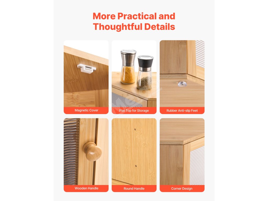 Tento drevený box na chlieb je vyrobený z prírodného bambusu a je spoľahlivý a odolný. Vetracie otvory v zadnej časti zlepšujú prúdenie vzduchu, čím predlžujú čerstvosť chleba a udržiavajú ho dlhšie chutný.