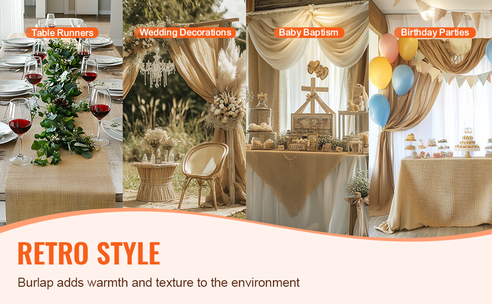 Teplé tóny a prirodzený vzhľad tohto plátna z juty ho predurčujú na použitie pri večierkoch, svadbách, oslavách narodenia dieťaťa a narodeninových oslavách. Dopĺňa každú kuchyňu alebo jedálenský kút bez toho, aby pôsobil rušivo, a vytvára útulnú a príjemnú atmosféru.