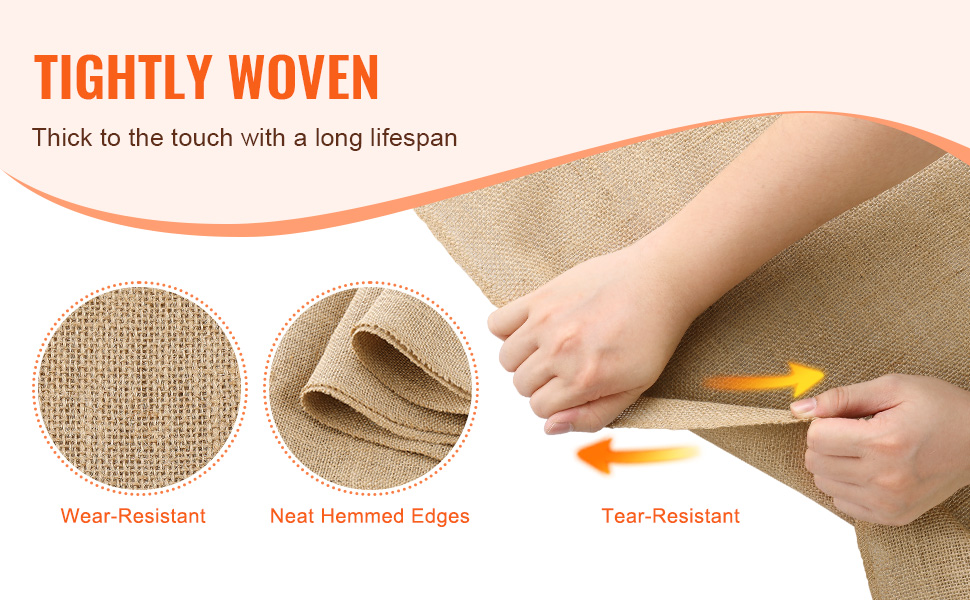 Táto rolka vrecoviny vyrobená zo 100 % prírodného jutového vlákna ponúka odolnosť a spoľahlivosť. Jej hustá väzba a úprava okrajov zabraňujú treniu. Rustikálny šarm tejto tkaniny dopĺňa svadby a večierky a zároveň sa stará o rastliny. K dispozícii v rôznych veľkostiach.