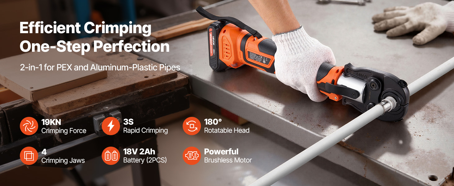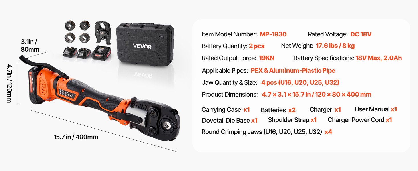 VEVOR 18V elektrický lis na rúry je vybavený 4 lisovacími čeľusťami (U16 mm, U20 mm, U25 mm, U32 mm) určenými na PEX a hliníkovo-plastové rúry. Poháňaný vysoko výkonným bezkartáčovým motorom poskytuje rýchle lisovanie bez netesností a bezpečné spoje. Bezšnúrové a prenosné na flexibilné použitie na cestách.
