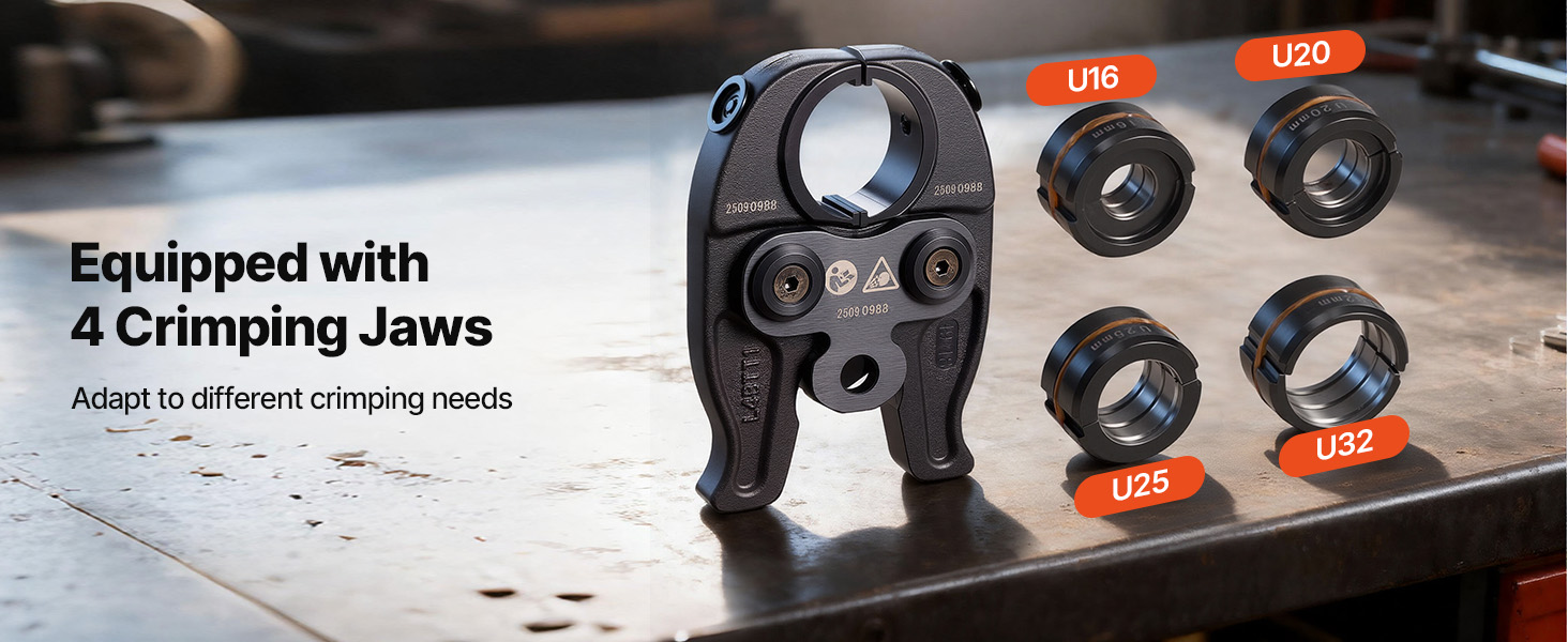 Obsahuje 4 vymeniteľné lisovacie čeľuste (U16 mm, U20 mm, U25 mm, U32 mm), ktoré ponúkajú flexibilné použitie pre rôzne veľkosti rúrok. Dosiahnite rýchlejšie, presnejšie a kvalitnejšie lisovanie s ľahkosťou.