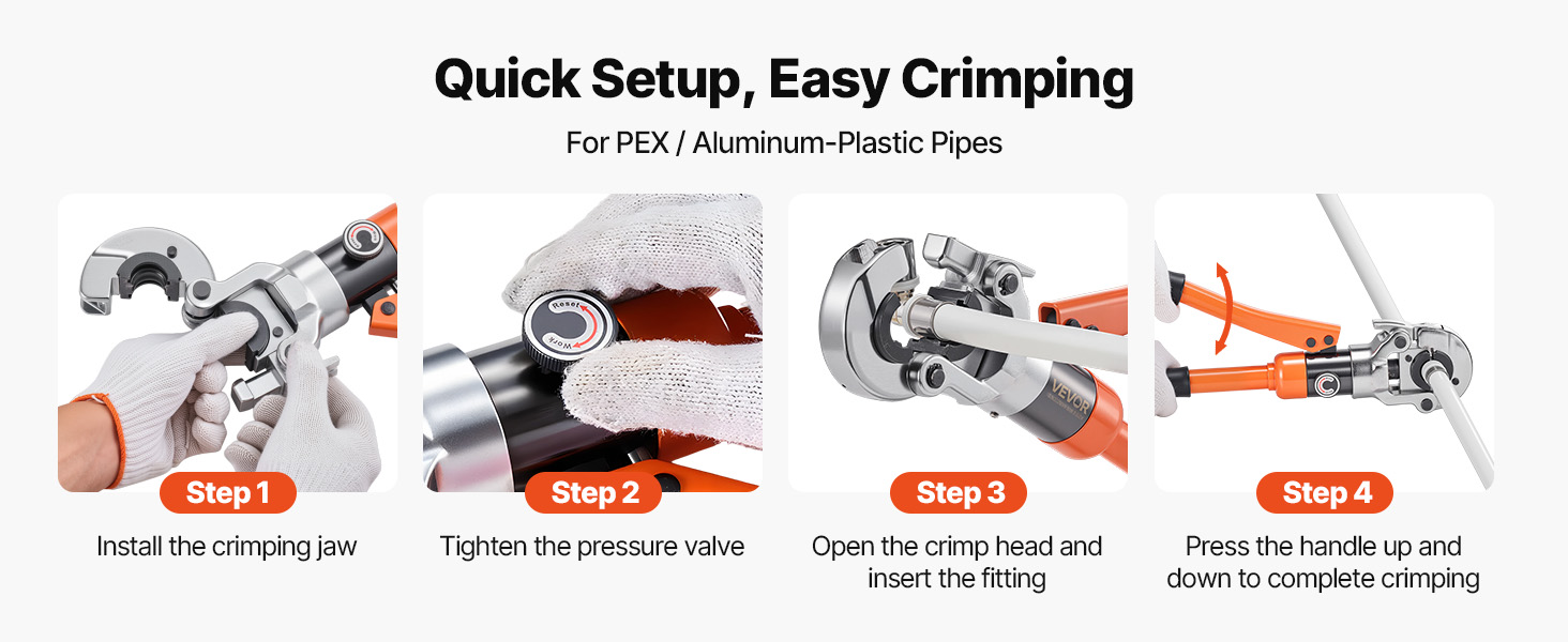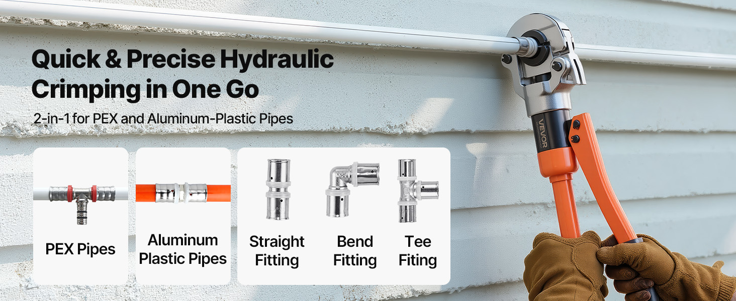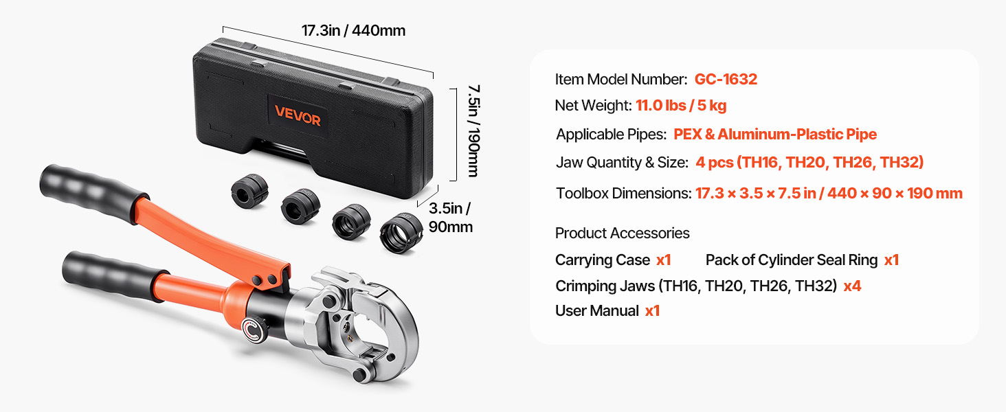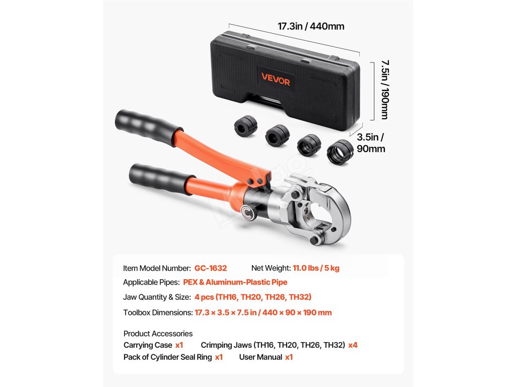 Hydraulický nástroj na lisovanie rúrok VEVOR sa dodáva so 4 lisovacími čeľusťami (TH16, TH20, TH26, TH32) určenými na PEX a hliníkovo-plastové rúrky. Poháňané pokročilým hydraulickým pohonným systémom poskytuje rýchle, netesné lisovanie a bezpečné spoje pre širokú škálu potrubných aplikácií.