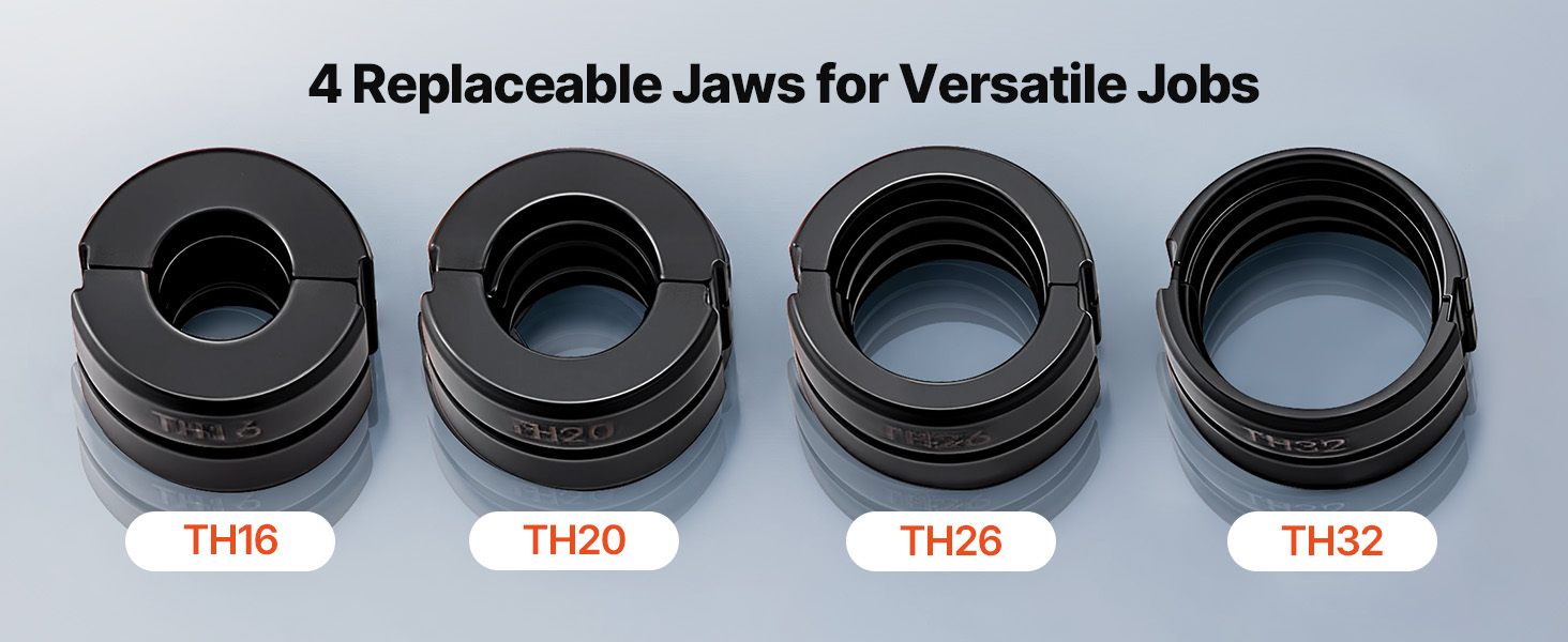 Obsahuje 4 vymeniteľné čeľuste (TH16, TH20, TH26, TH32), ktoré ponúkajú flexibilné použitie pre rôzne veľkosti potrubí. Ľahko dosiahnete rýchlejšie, presnejšie a kvalitnejšie lisovanie.
