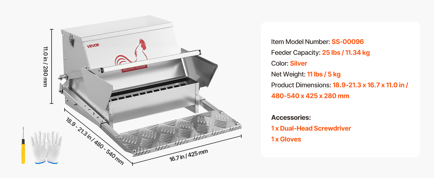 | Feeder Capacity | 25 lbs/11.34 kg |
