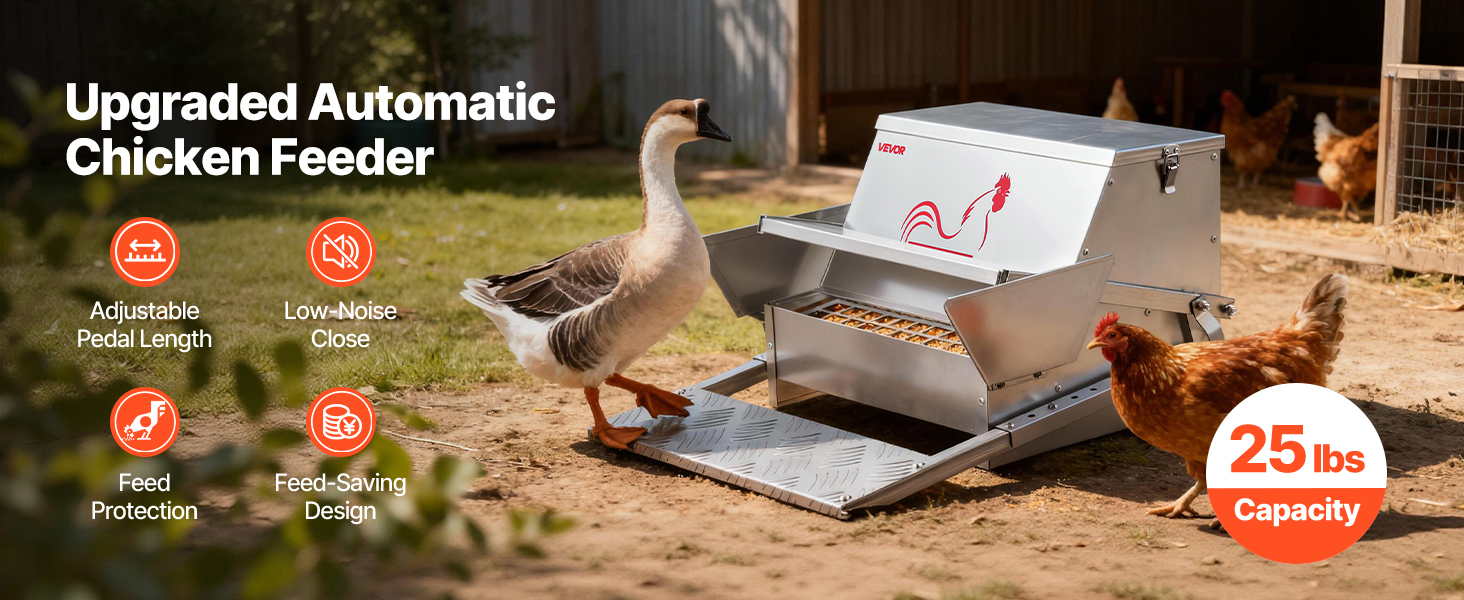 Tento automatický kŕmidlo pre kurčatá s nosnosťou 25 libier má nastaviteľnú dĺžku pedála, vďaka čomu ho môžete prispôsobiť veľkosti hydiny. Je vhodné pre stredne veľké a malé kurčatá a inú hydinu.