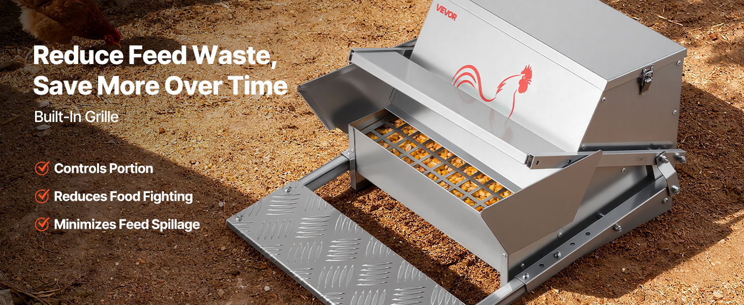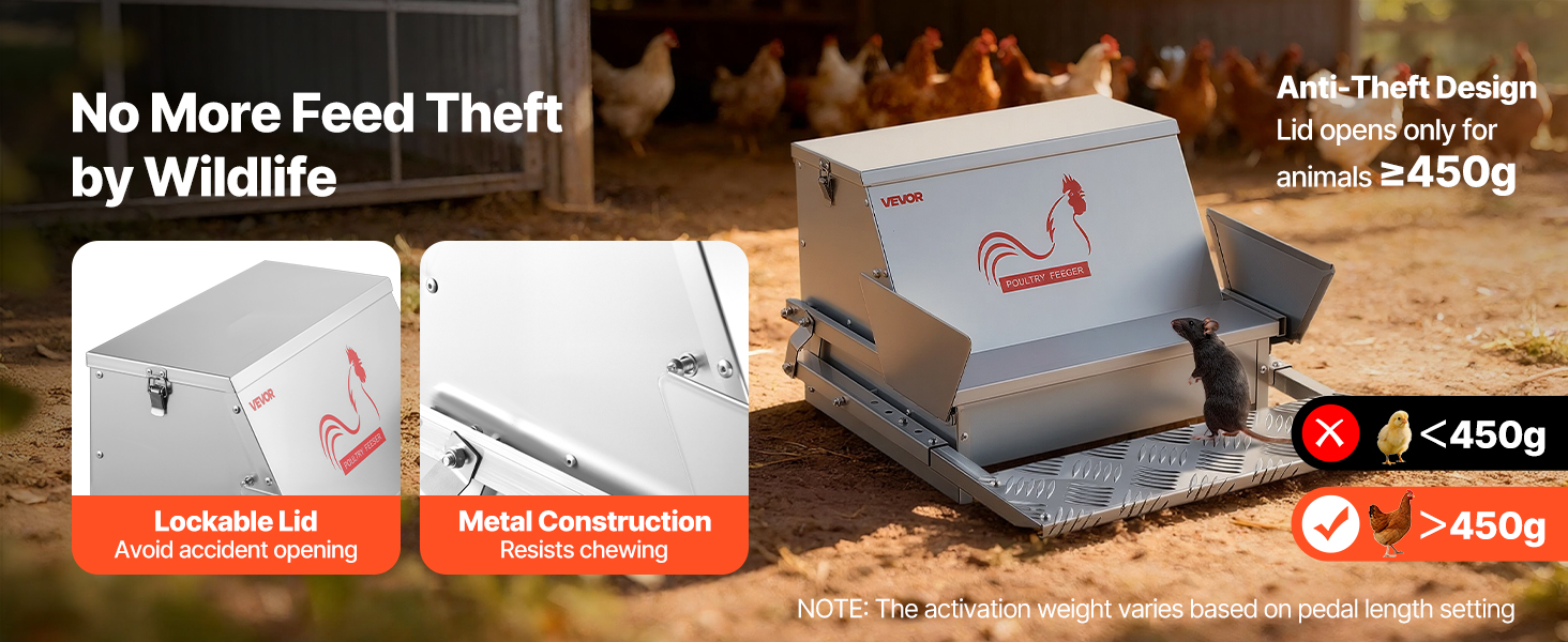 Vďaka konštrukcii pedála odolnej proti krádeži náš kŕmidlo pre kurčatá podporuje len zvieratá s hmotnosťou nad 450 g, ktoré majú prístup k krmivu. Zabraňuje menším zvieratám, ako sú veveričky a vtáky, v krádeži krmiva.