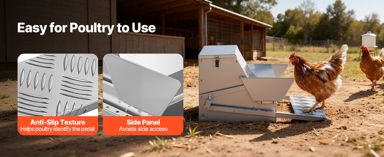 Tento kŕmidlo pre hydinu je vybavené jedinečným pedálom s protišmykovou textúrou, ktorý pomáha hydine identifikovať správnu polohu pri kŕmení. Bočné panely zabraňujú kŕmeniu z bokov, čím znižujú riziko zranenia a zabezpečujú pohodlné kŕmenie.