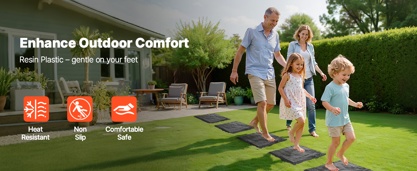 Vystúpený textúrovaný povrch poskytuje odolnosť proti pošmyknutiu a zostáva chladný pod nohami – ideálny pre letné prechádzky naboso. Hladké, zaoblené hrany zaručujú bezpečnosť pre deti a domáce zvieratá a ponúkajú pohodlný a rodinný zážitok z chôdze.