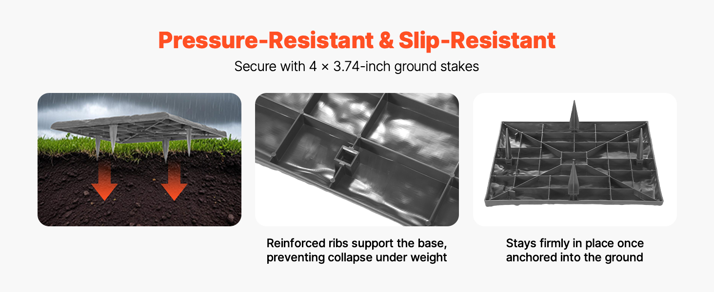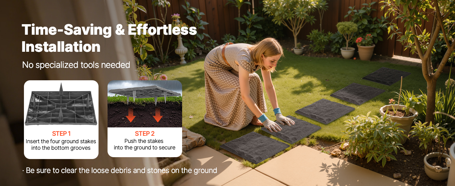 Každý záhradný nášľapný kameň obsahuje štyri 3,74-palcové (95 mm) kolíky do zeme a zosilnenú základňu na zvýšenie stability. Sú navrhnuté tak, aby pevne stáli na mieste pod tlakom a vo vlhkých podmienkach, čím zabraňujú posunu alebo pošmyknutiu, čím zabezpečujú bezpečnejší vonkajší priestor.
