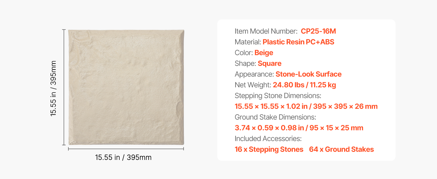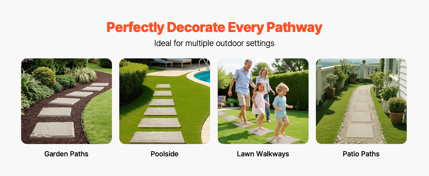 Tieto 16-dielne záhradné krokové kamene sú vyrobené z odolného PC a ABS plastu, ktorý odoláva slnku, dažďu a mrazu bez deformácie alebo vyblednutia. Každý krokový kameň obsahuje 4 zemné kolíky a vystuženú základňu pre extra stabilitu – ideálne pre domácnosti s deťmi a domácimi zvieratami.