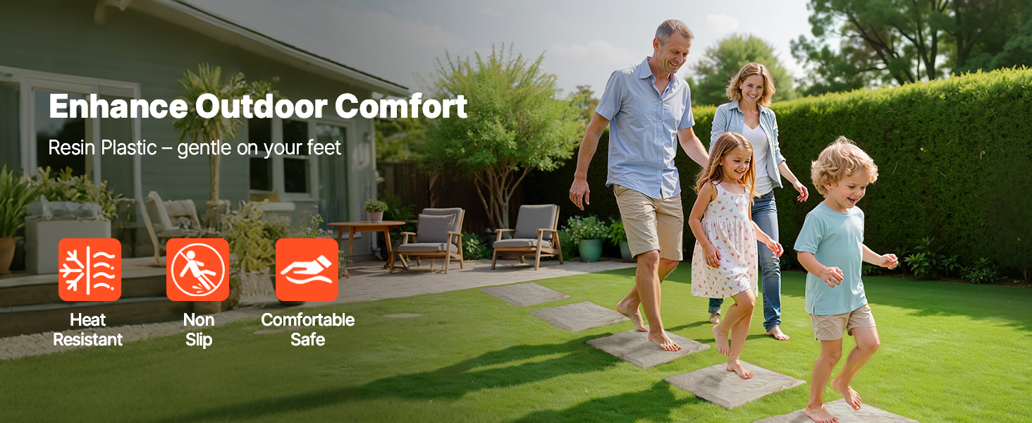 Vystúpený textúrovaný povrch poskytuje odolnosť proti pošmyknutiu a zostáva chladný pod nohami – ideálny pre letné prechádzky naboso. Hladké, zaoblené hrany zaručujú bezpečnosť pre deti a domáce zvieratá a ponúkajú pohodlný a rodinný zážitok z chôdze.