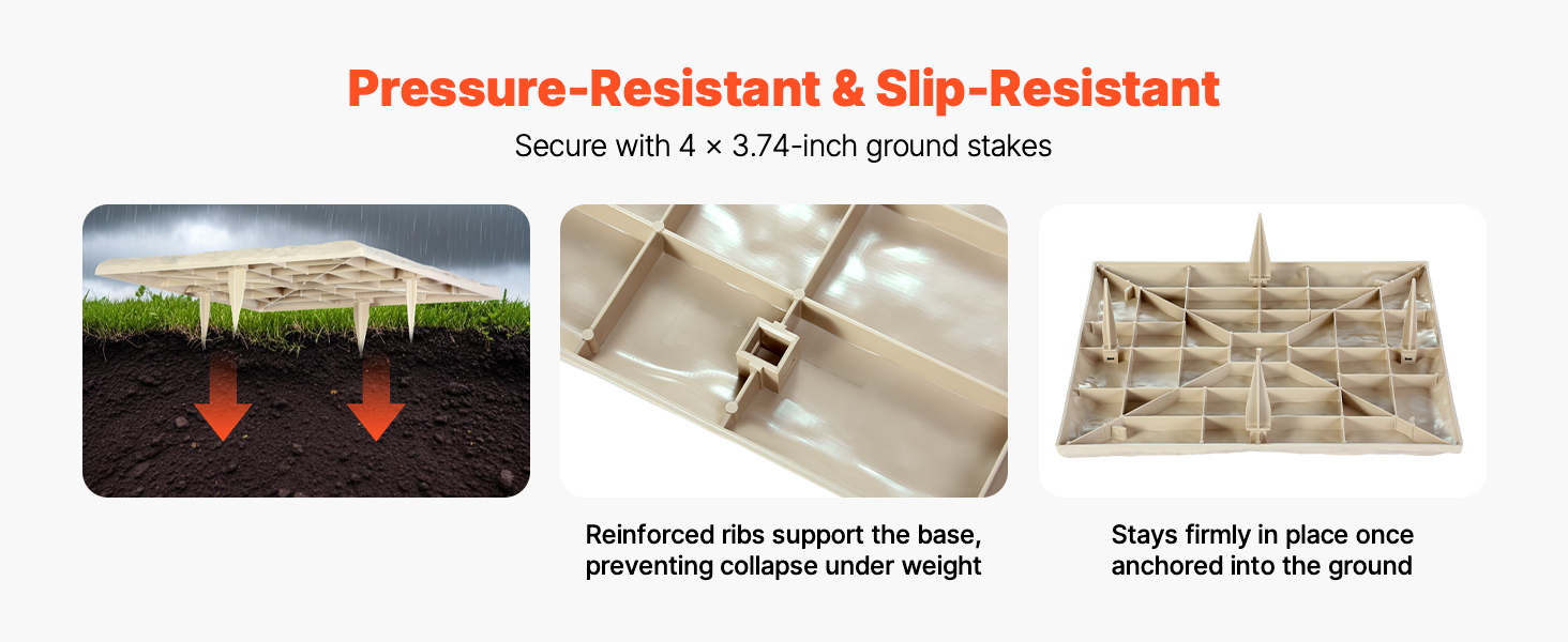 Každý záhradný kamienok obsahuje štyri 3,74-palcové (95 mm) zemné kolíky a vystuženú základňu pre väčšiu stabilitu. Navrhnuté tak, aby zostali pevne na mieste aj pod tlakom a za mokrých podmienok, čím sa zabráni posunutiu alebo pošmyknutiu a zabezpečí bezpečnejší vonkajší priestor.