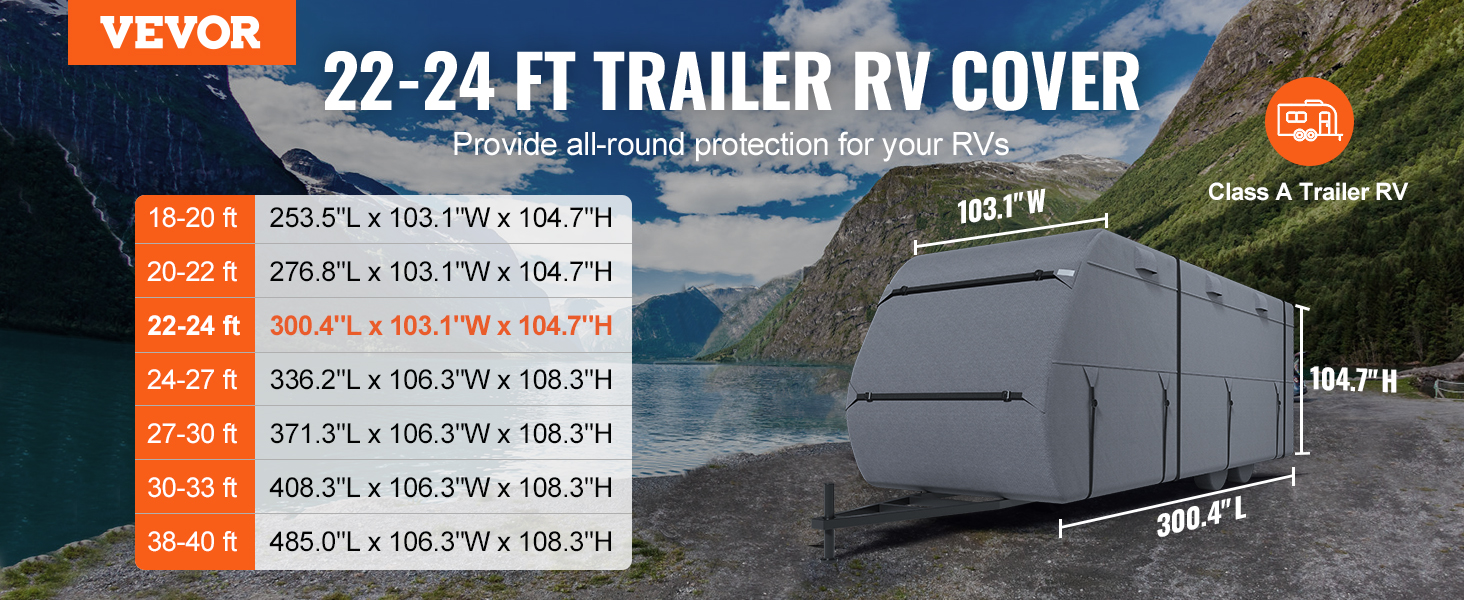 Náš kryt na cestovný príves triedy A je starostlivo navrhnutý tak, aby sa zmestil na 22'-24'' obytné vozidlá a poskytoval dokonalú ochranu. Pre správnu inštaláciu zabezpečte presné rozmery vášho obytného vozidla. Poskytujeme aj rôzne veľkosti krytov na RV, ktoré spĺňajú vaše špecifické potreby.