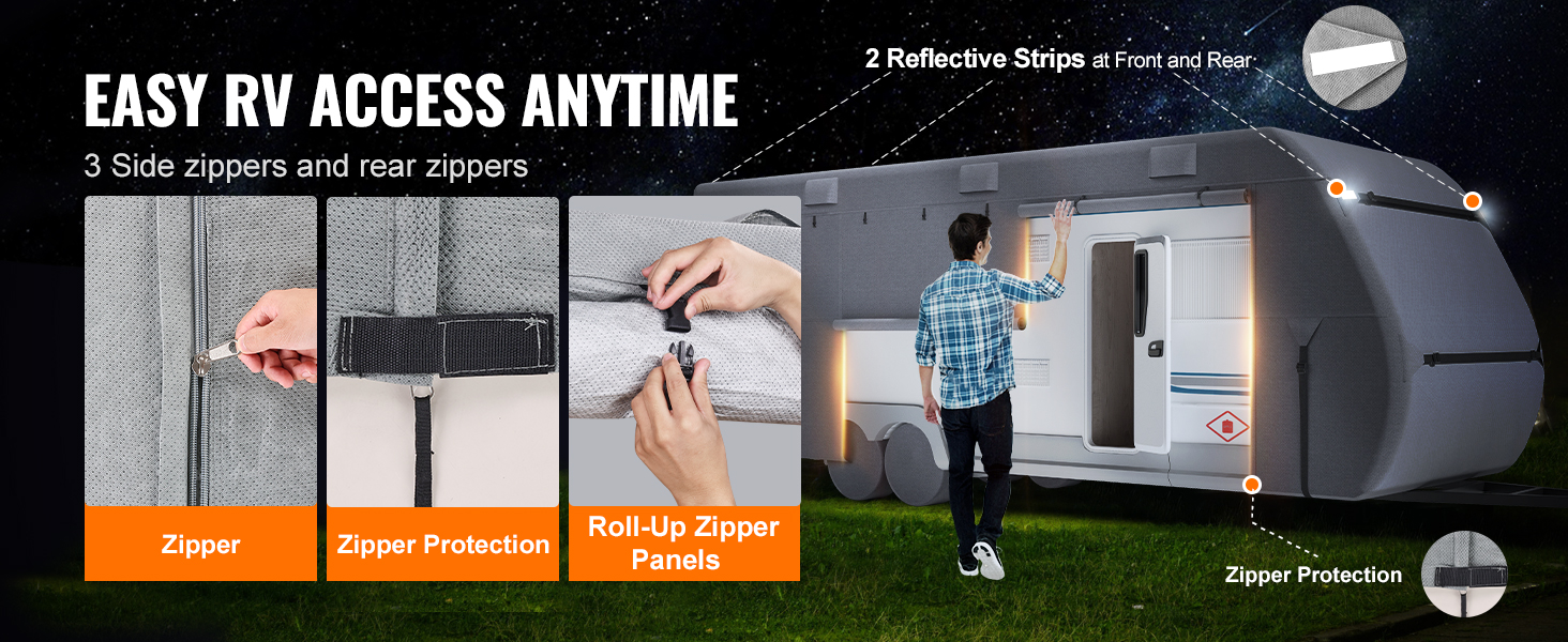 Bočné a zadné dvere krytu na karavan na zips umožňujú jednoduchý prístup do vášho obytného vozidla. Spodná časť zipsu je vystužená rozšíreným suchým zipsom a reflexné pásy na prednej a zadnej strane zlepšujú viditeľnosť v noci a na snehu, čím zabezpečujú, že váš karavan bude ľahko viditeľný.