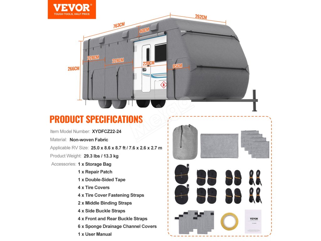 Kryt na cestovný príves je vybavený špongiovými drenážnymi krytmi, ktoré zabraňujú prepichnutiu pre RV s drenážnymi systémami. Je vybavený štítkami "FRONT" a "END" na jednoduchú identifikáciu počas inštalácie. Poškodenie možno rýchlo opraviť pomocou priloženej obojstrannej lepiacej pásky.