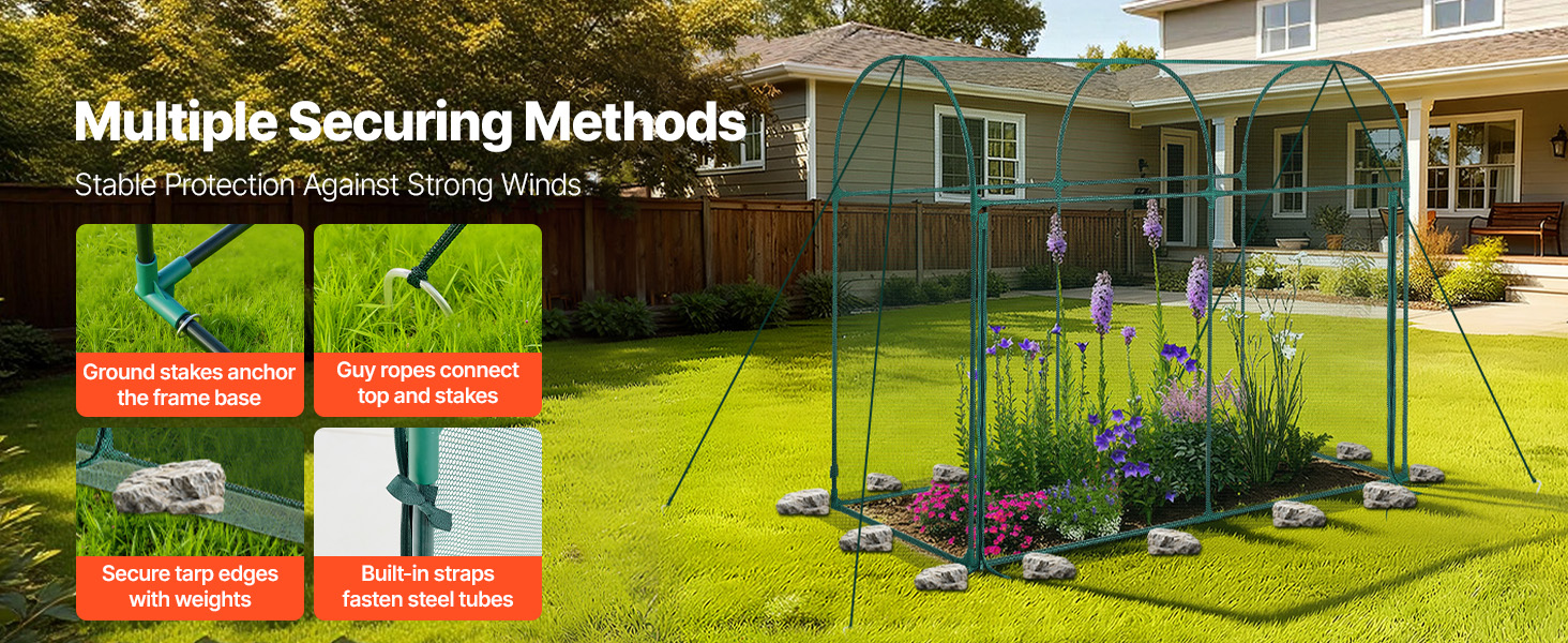 Tento ochranný stan pre rastliny obsahuje viacero spôsobov upevnenia. Zemné kolíky ukotvujú rám v základni, zatiaľ čo napínacie laná upevňujú vrchol k zemi, čím vytvárajú stabilnú 3D oporu. Predĺžené okraje môžu byť zaťažené a vstavané popruhy upevňujú kryt k oceľovej rámovej rúrke.