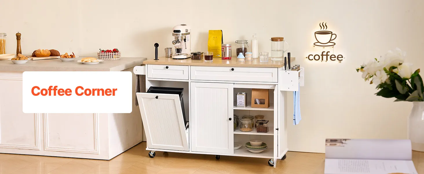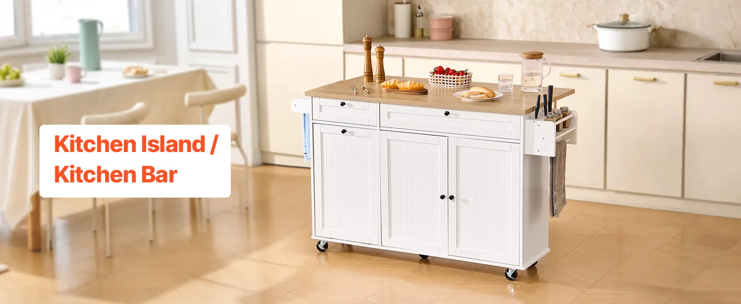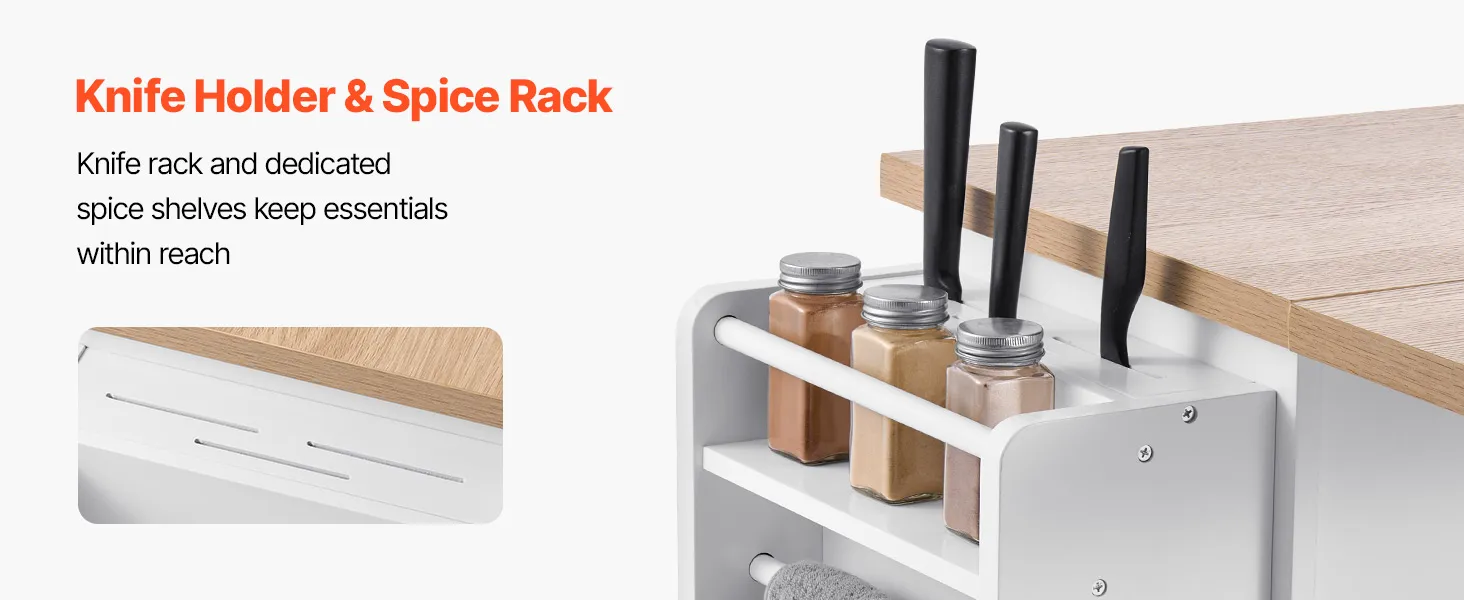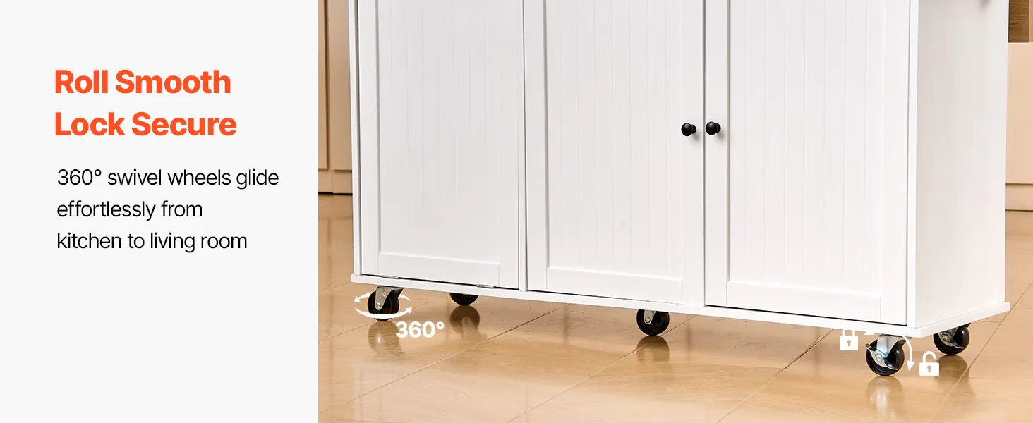 Tento všestranný ostrov kombinuje regály, police a skrinky na jednoduché usporiadanie kuchynského riadu, náčinia a základných vecí v špajze. Hladko sa pohybujúce kolieska sa bez námahy posúvajú po podlahe a umožňujú vám premiestniť zariadenie z kuchynskej linky do jedálne alebo dokonca na vonkajšie grilovanie.