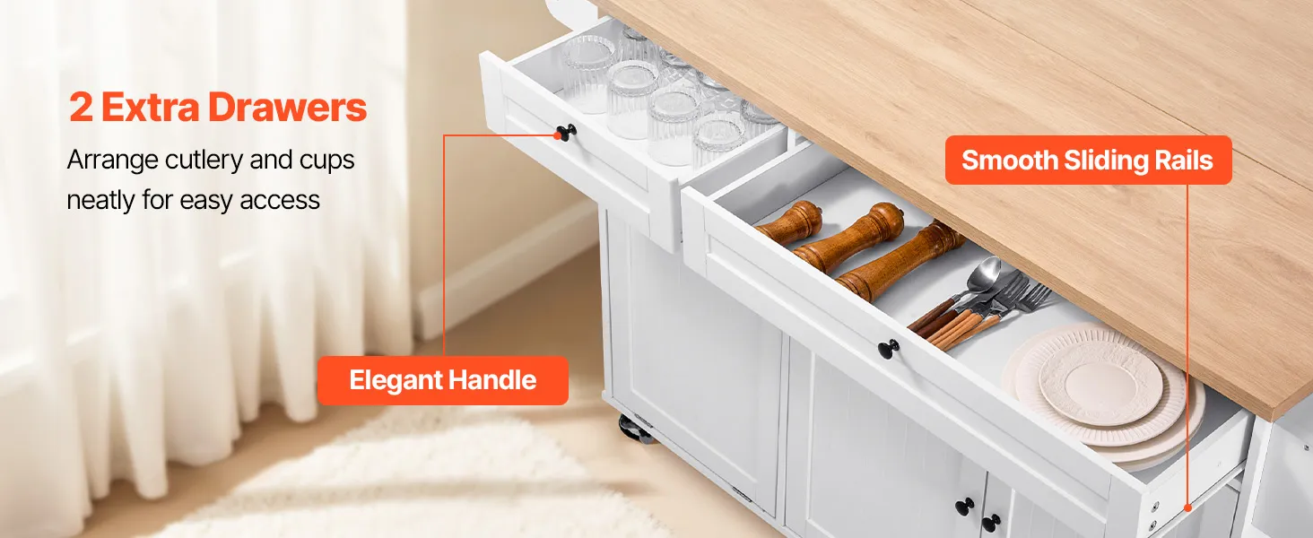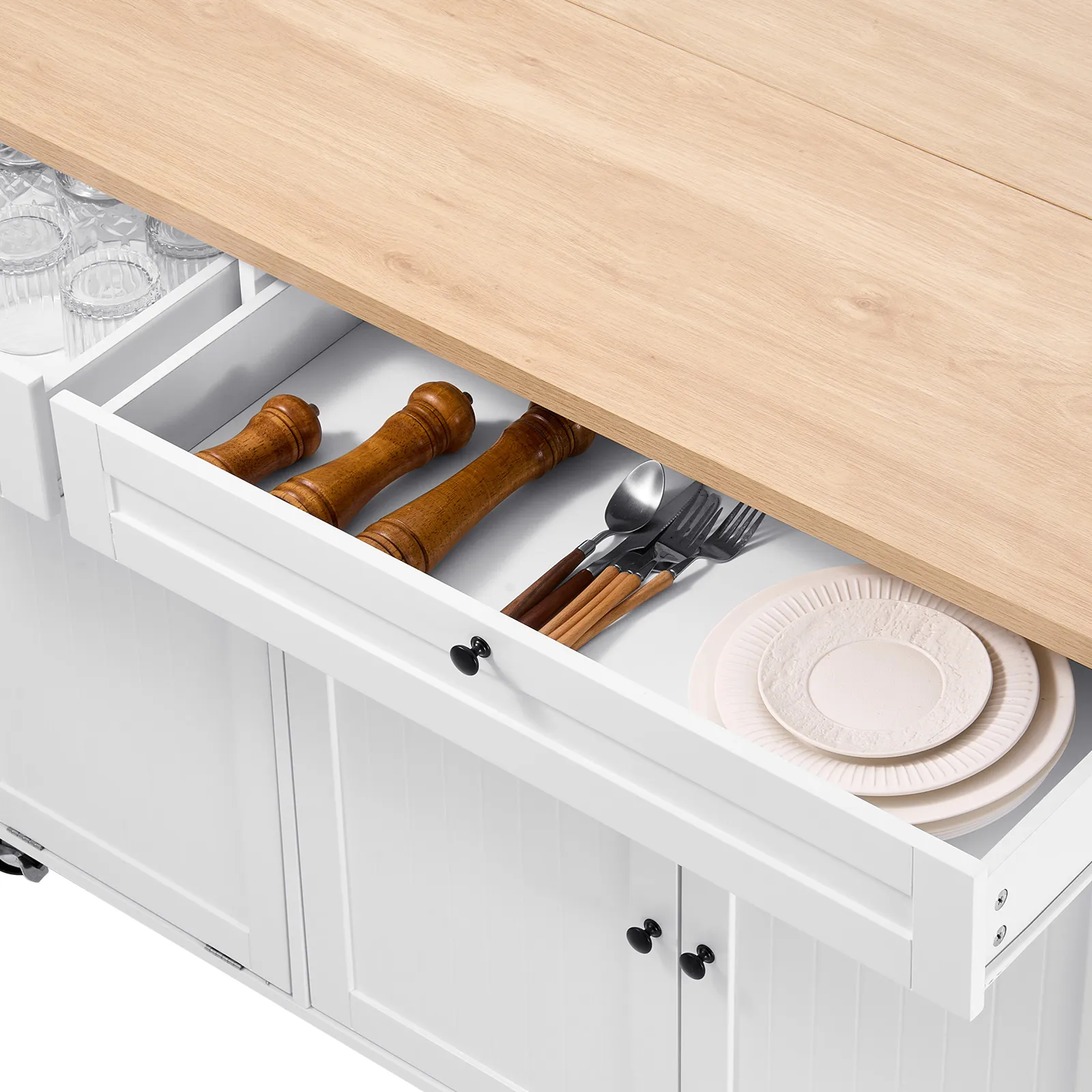 Kuchynský ostrovček 153 cm na kolieskach, 2 zásuvky, sklopná doska