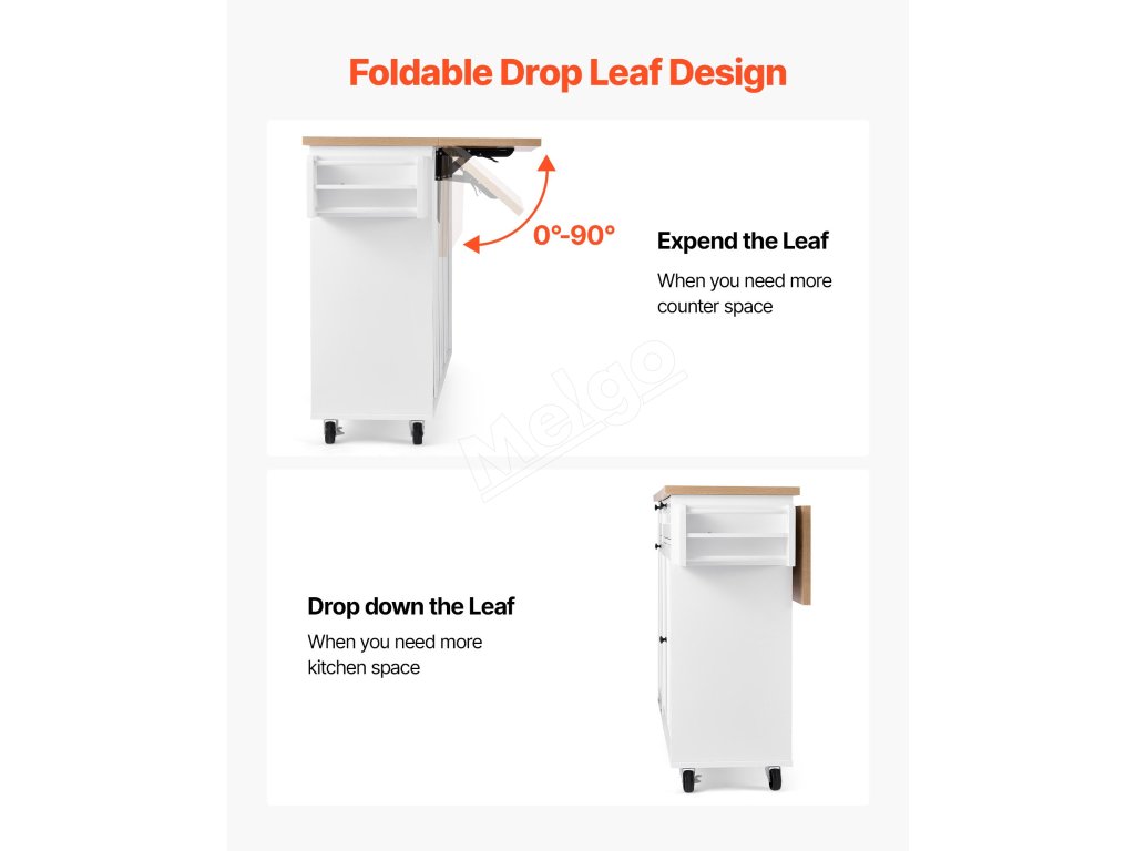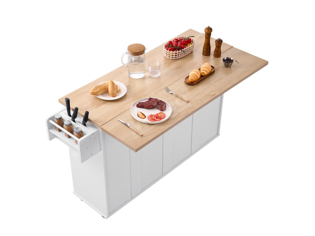 Kuchynský ostrovček 153 cm na kolieskach, 2 zásuvky, sklopná doska