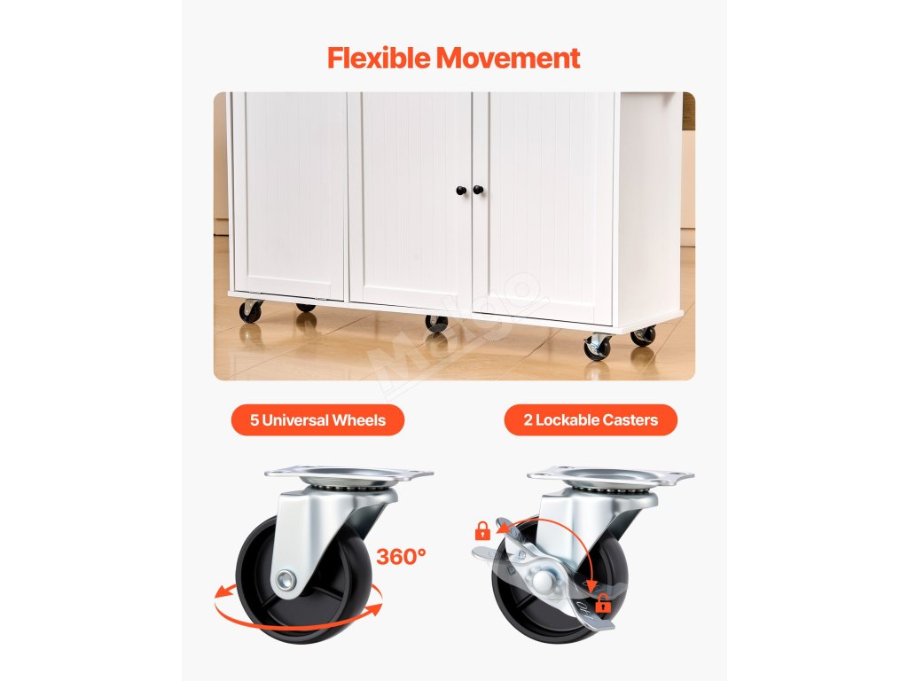 Náš kuchynský úložný ostrovček vlastní uzamykateľné kolieska, ktoré umožňujú plynulú zmenu polohy a bezpečné umiestnenie, čím sa prispôsobí dynamickému usporiadaniu kuchyne a zároveň si zachová stabilitu počas používania.