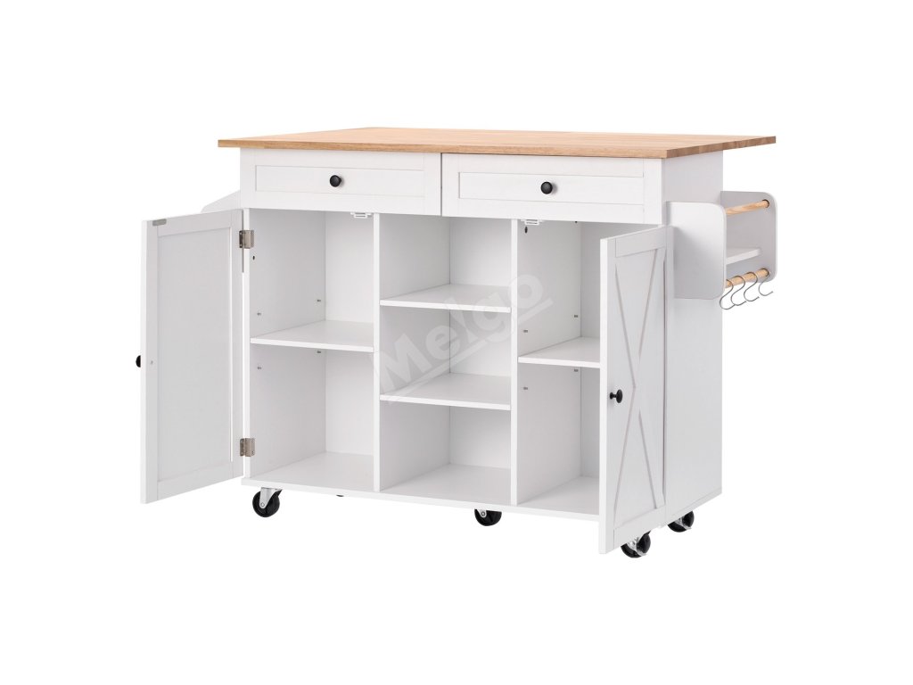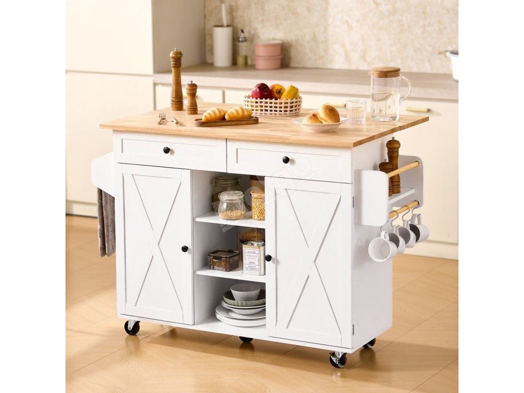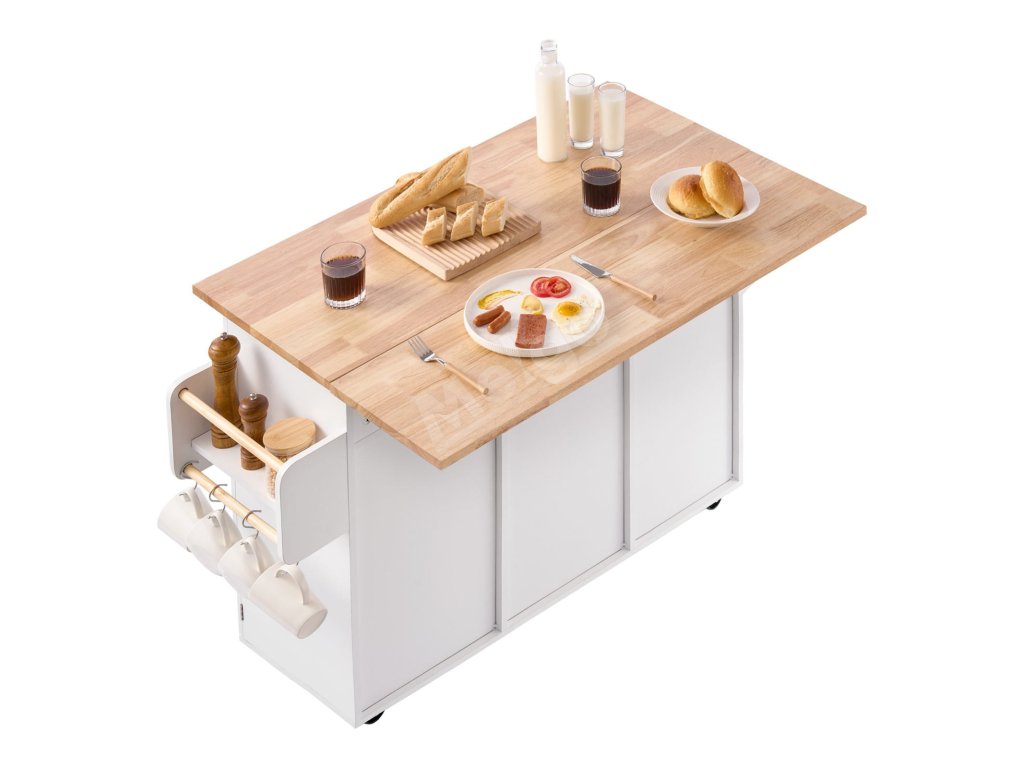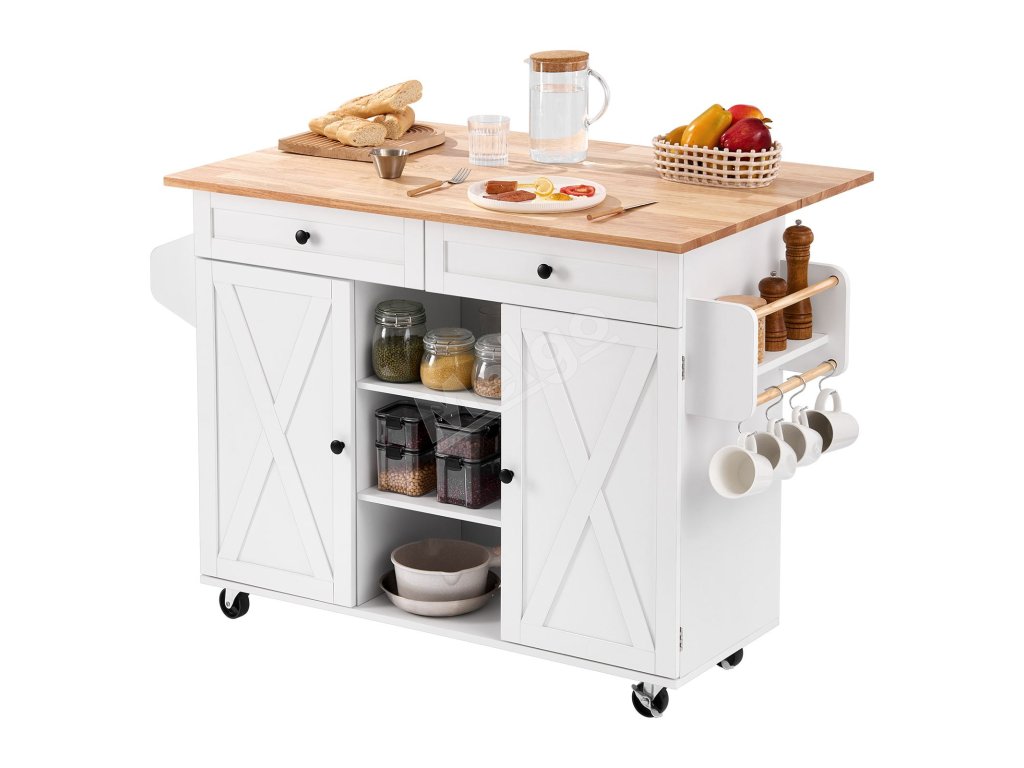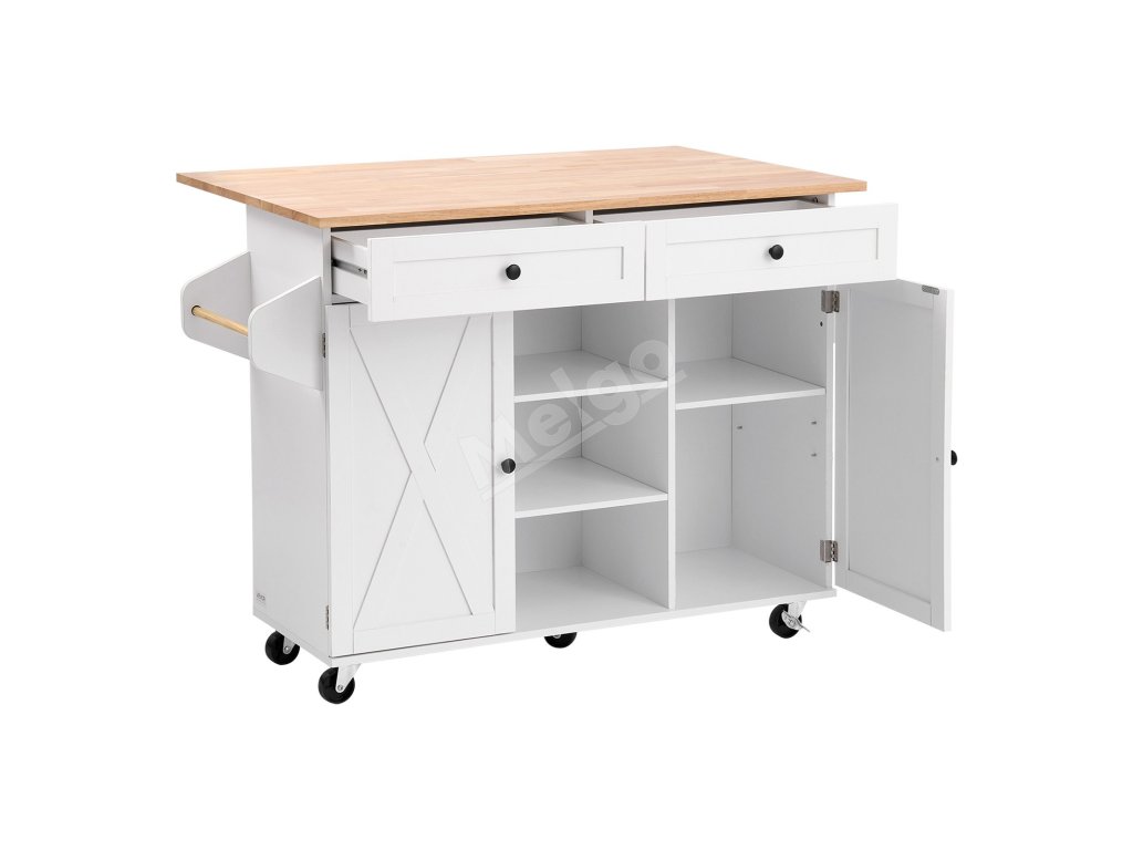 Kuchynský ostrovček s masívnym dreveným vrchom, pojazdný, 132cm, biely
