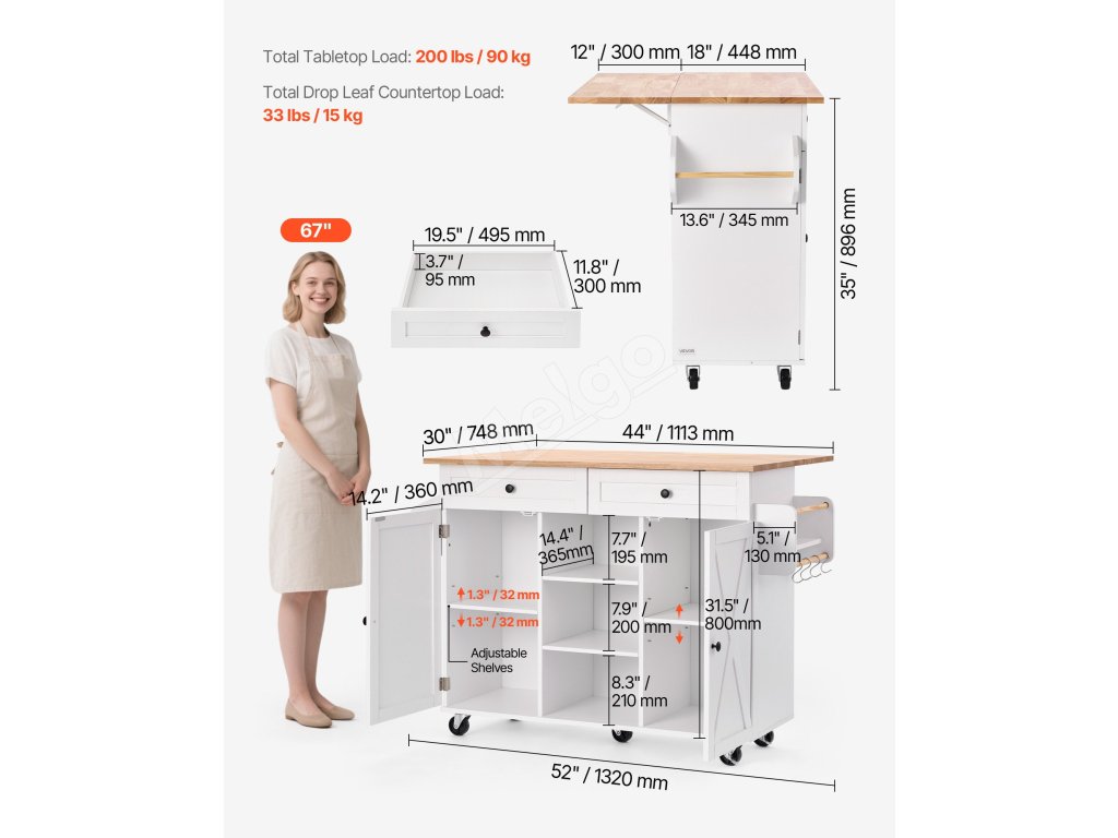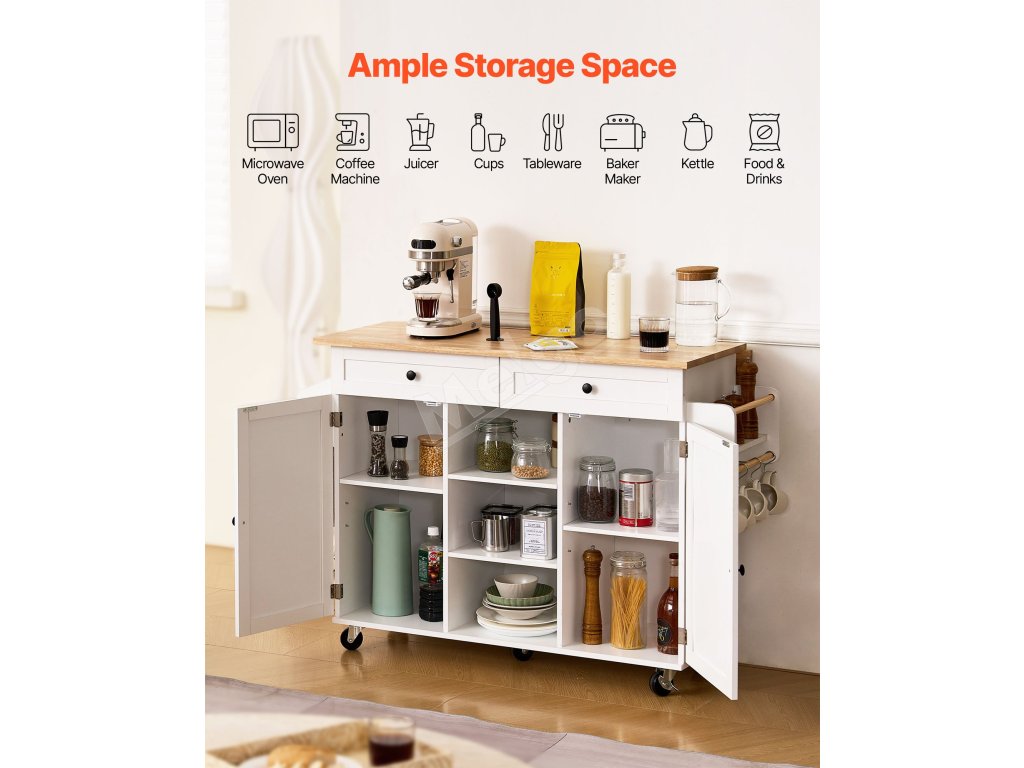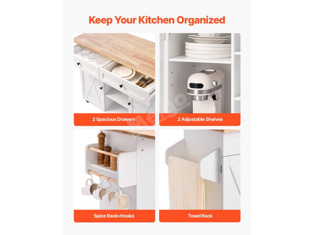Tento všestranný ostrov kombinuje regály, police a skrinky na jednoduché usporiadanie kuchynského riadu, náčinia a základných vecí v špajze. Hladko sa pohybujúce kolieska sa bez námahy posúvajú po podlahe a umožňujú vám premiestniť zariadenie z kuchynskej linky do jedálne alebo dokonca na vonkajšie grilovanie.