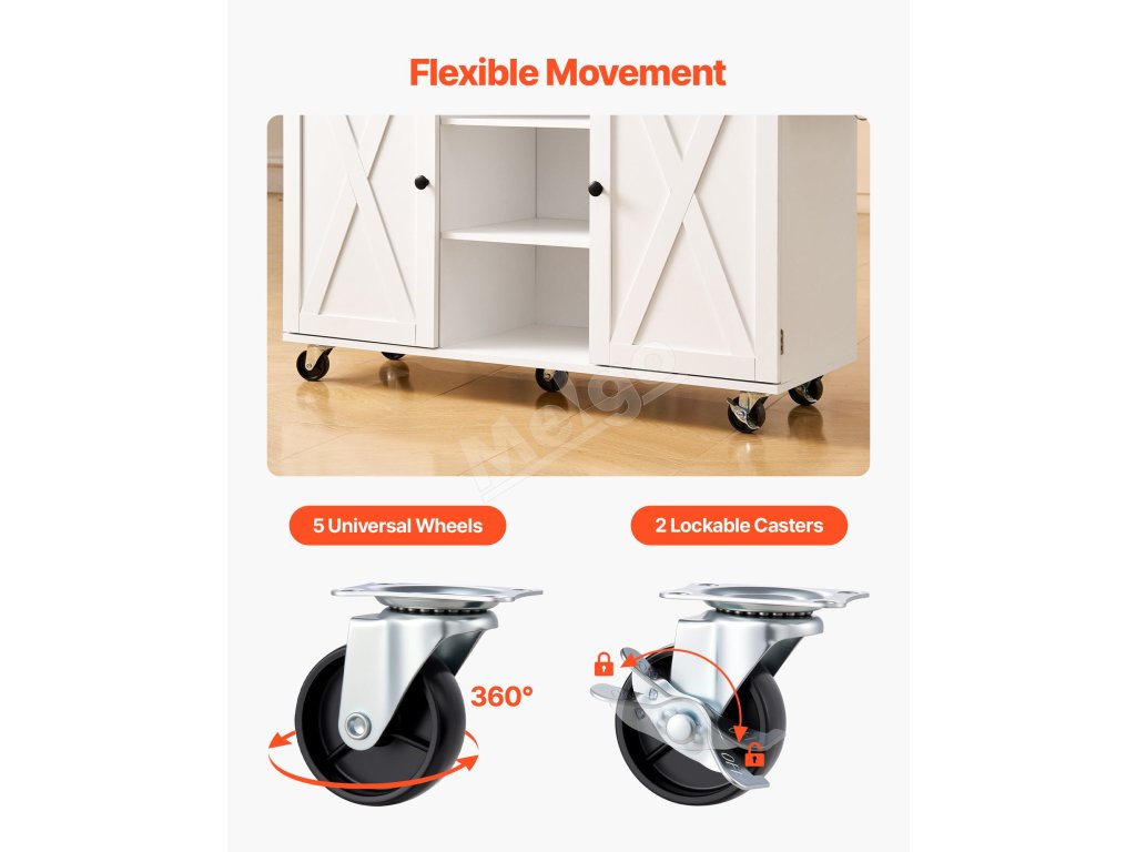 Náš kuchynský úložný ostrovček vlastní uzamykateľné kolieska, ktoré umožňujú plynulú zmenu polohy a bezpečné umiestnenie, čím sa prispôsobí dynamickému usporiadaniu kuchyne a zároveň si zachová stabilitu počas používania.