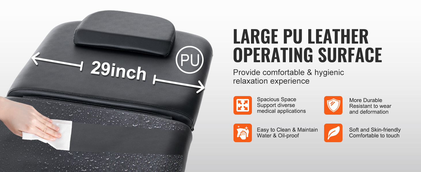 Doprajte si luxus v podobe 29-palcovej širokej stolovej dosky, ktorá poskytuje dostatok priestoru pre vašich klientov na plné uvoľnenie a natiahnutie. Stolová doska z PU kože ponúka mäkký povrch šetrný k pokožke, ktorý sa ľahko čistí a udržiava, ideálny nástroj na masáže, terapiu chrbtice a iné procedúry.