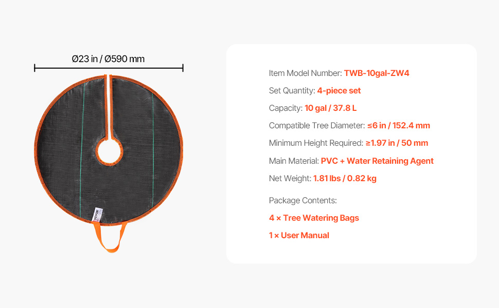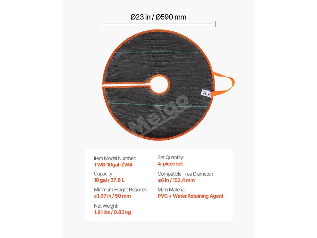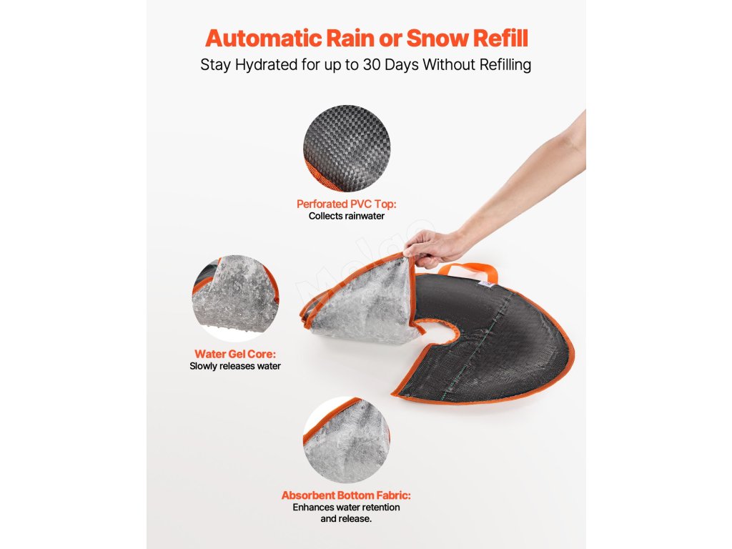 Tento zavlažovací krúžok poskytuje spoľahlivé a účinné zavlažovanie novovysadených stromov alebo stromov citlivých na sucho. Vďaka samozavlažovacej konštrukcii automaticky dopĺňa vodu absorbovaním dažďa alebo snehu. Môže fungovať až 30 dní v závislosti od miestnej vlhkosti, teploty a zrážok.
