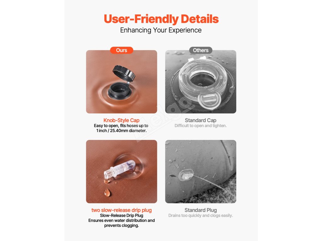 Odvodňovací vývod je vybavený pomaly sa uvoľňujúcim kvapkacím ventilom na rovnomernú distribúciu vody bez upchávania, čo zabezpečuje stabilný prísun vlahy. Konštrukcia s dvojitou rukoväťou uľahčuje premiestňovanie a inštaláciu vaku.