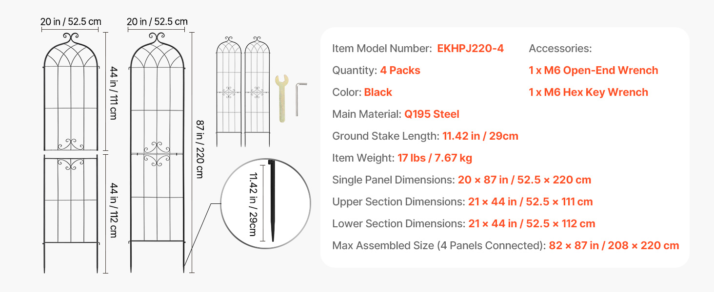 Každý panel mreže na popínavé plamienky sa skladá z dvoch častí, ktoré sa rýchlo zmontujú pomocou priloženého kľúča a skrutiek. Vstavané uzamykateľné spojky umožňujú spojiť viacero panelov a flexibilne nastaviť uhly, čím je ľahké vytvoriť ideálny tvar pre vašu záhradu.