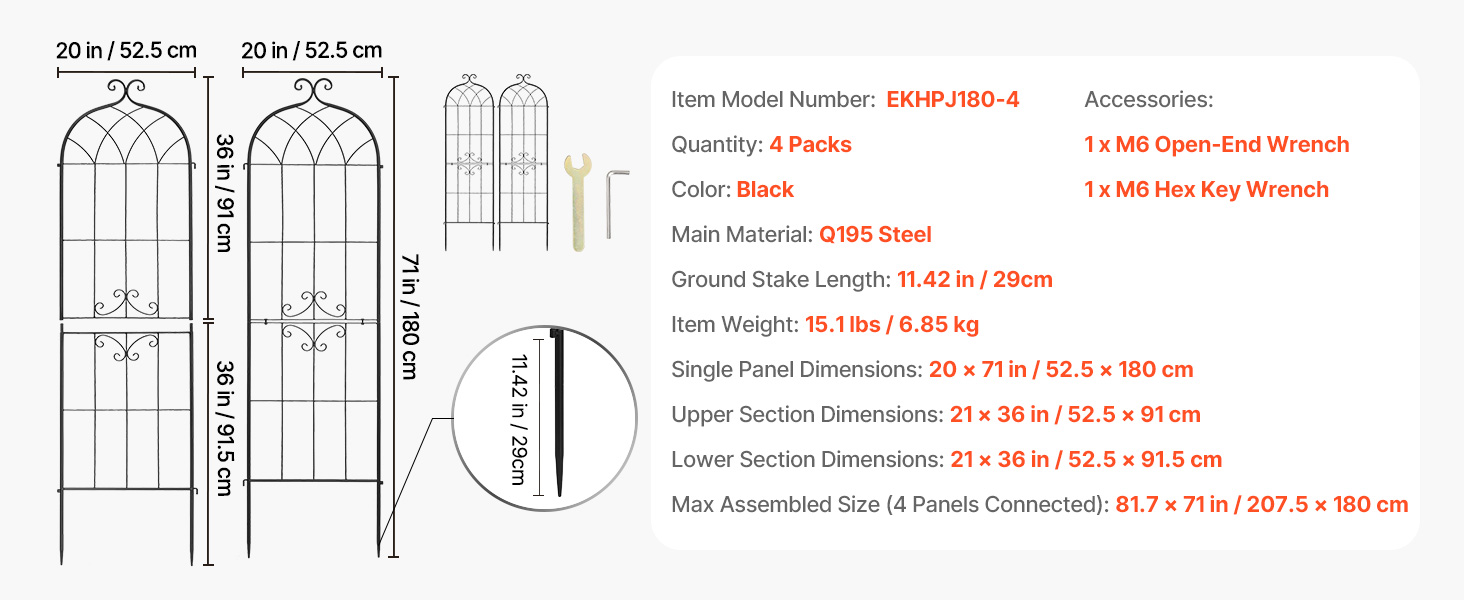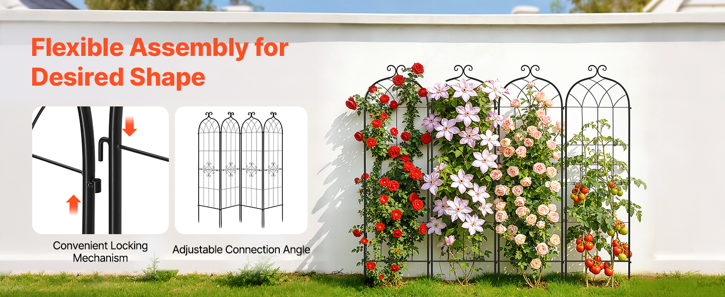 Každý panel mreže na popínavé plamienky sa dodáva v dvoch častiach, ktoré sa rýchlo zmontujú pomocou priloženého kľúča a skrutiek. Vstavané uzamykacie spojky vám umožňujú spojiť viacero panelov a flexibilne nastaviť uhly, vďaka čomu je jednoduché vytvoriť ideálny tvar pre rozloženie vašej záhrady.