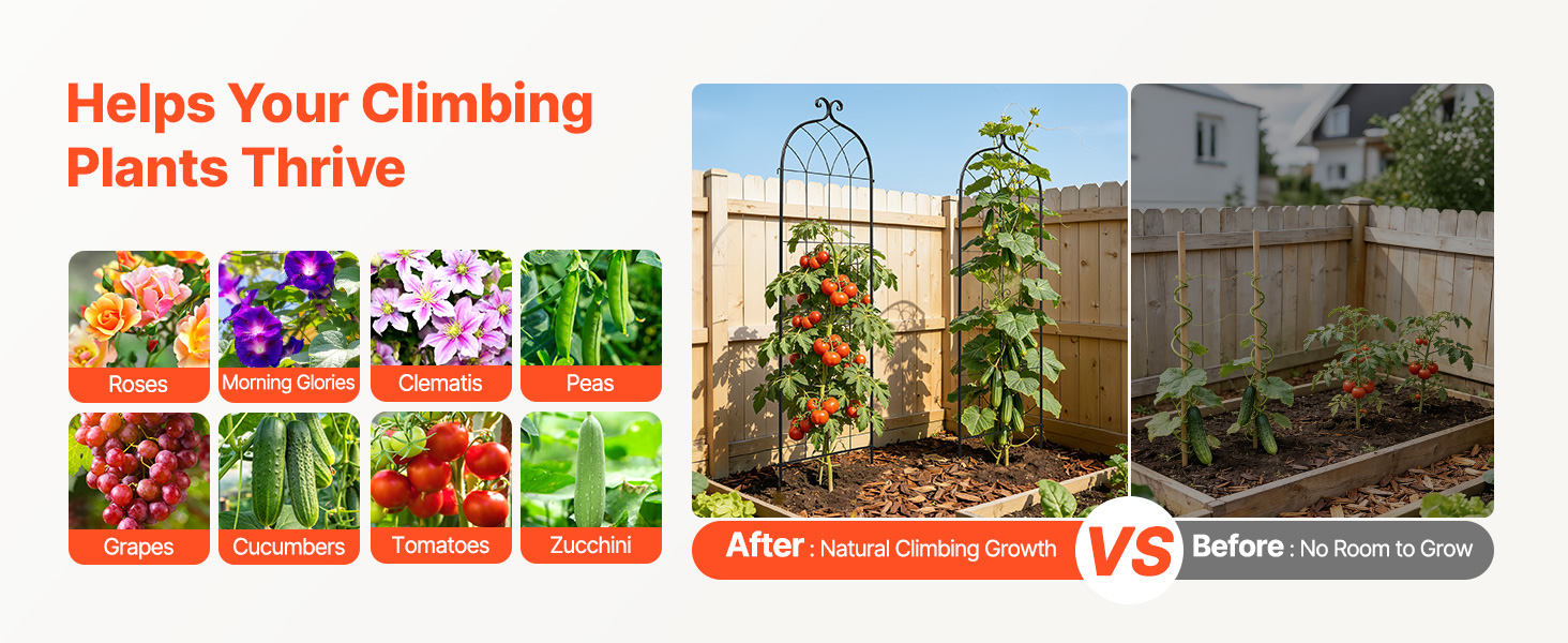 Táto záhradná mreža na ruže, navrhnutá na podporu rôznych popínavých rastlín a popínavých zelenín, poskytuje rastlinám priestor na silný a vzpriamený rast. Je ideálna pre popínavé ruže, brečtan, plamienok, jazmín, povojníky, uhorky, paradajky, hrach a ďalšie rastliny.