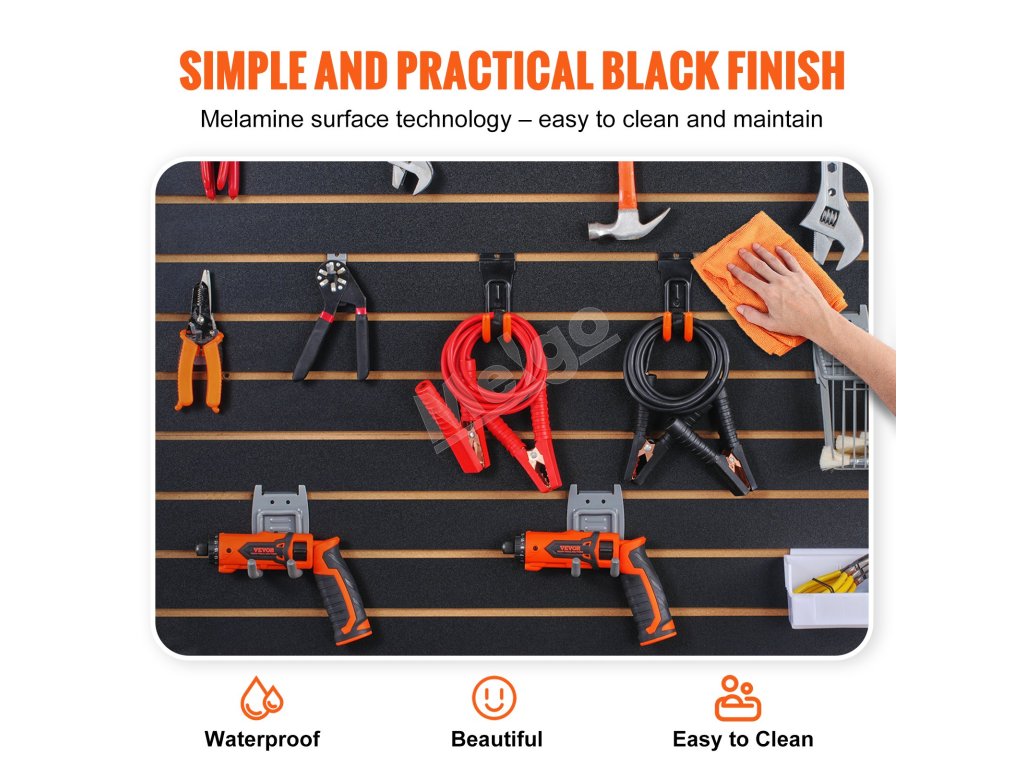 Naše lamelové nástenné panely sú stohovateľné s hornými a spodnými polovičnými drážkami, ktoré vyhovujú všetkým výškam, a s elegantným čiernym melamínovým povrchom, ktorý kričí štýlom.