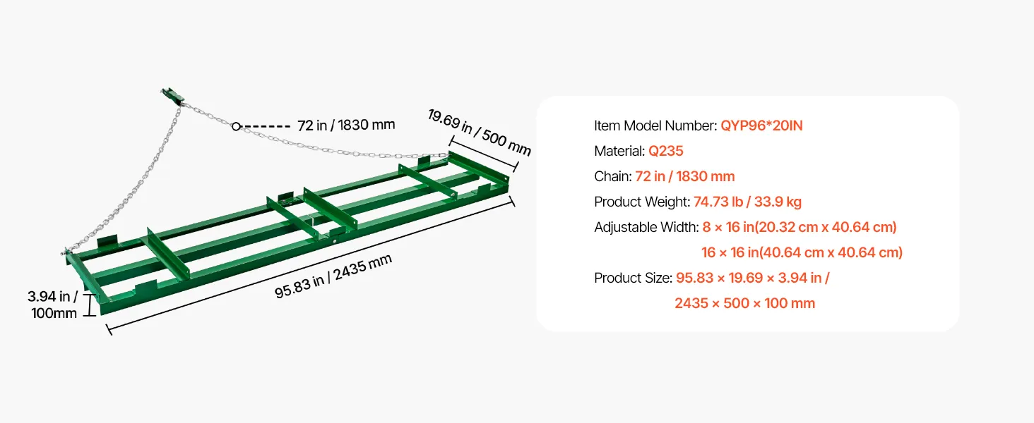 Ťahacie hrable 8 ft nastaviteľné s 72 in reťazou pre traktor