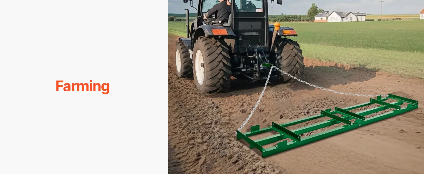 Táto vlečná brána vyrobená z vysokopevnostnej ocele Q235 sa ľahko prispôsobí náročnej pôde a skalnatému terénu. Povrchová úprava odolná proti korózii zaisťuje dlhodobú odolnosť v meniacom sa počasí, vďaka čomu budú vaše úlohy spojené s obhospodarovaním pôdy efektívne v akomkoľvek prostredí.