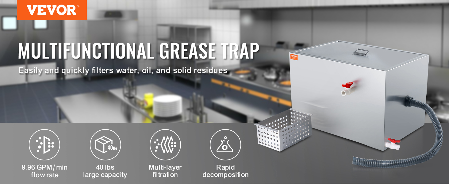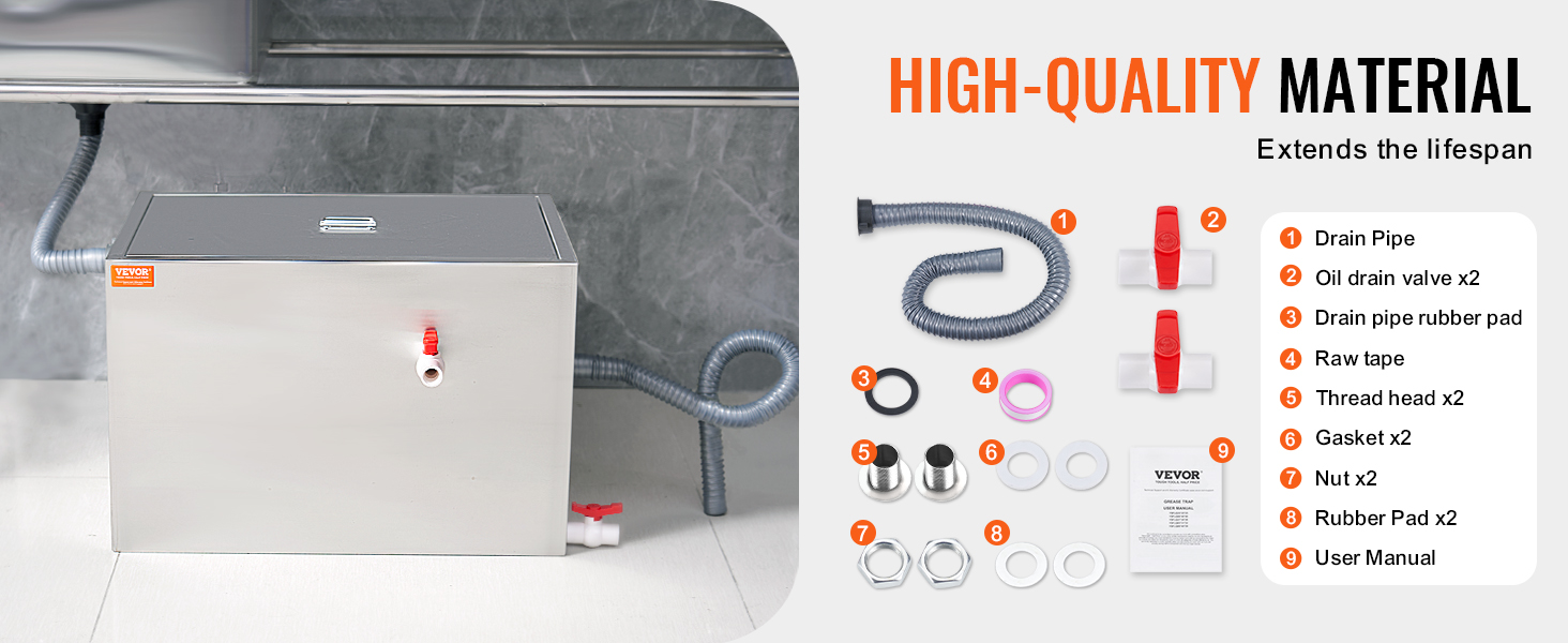 Tento komerčný zachytávač tukov je celý vyrobený z vysokokvalitných materiálov, vďaka čomu je pevný, odolný a odolný voči deformácii. Dodáva sa s kompletnou sadou príslušenstva.