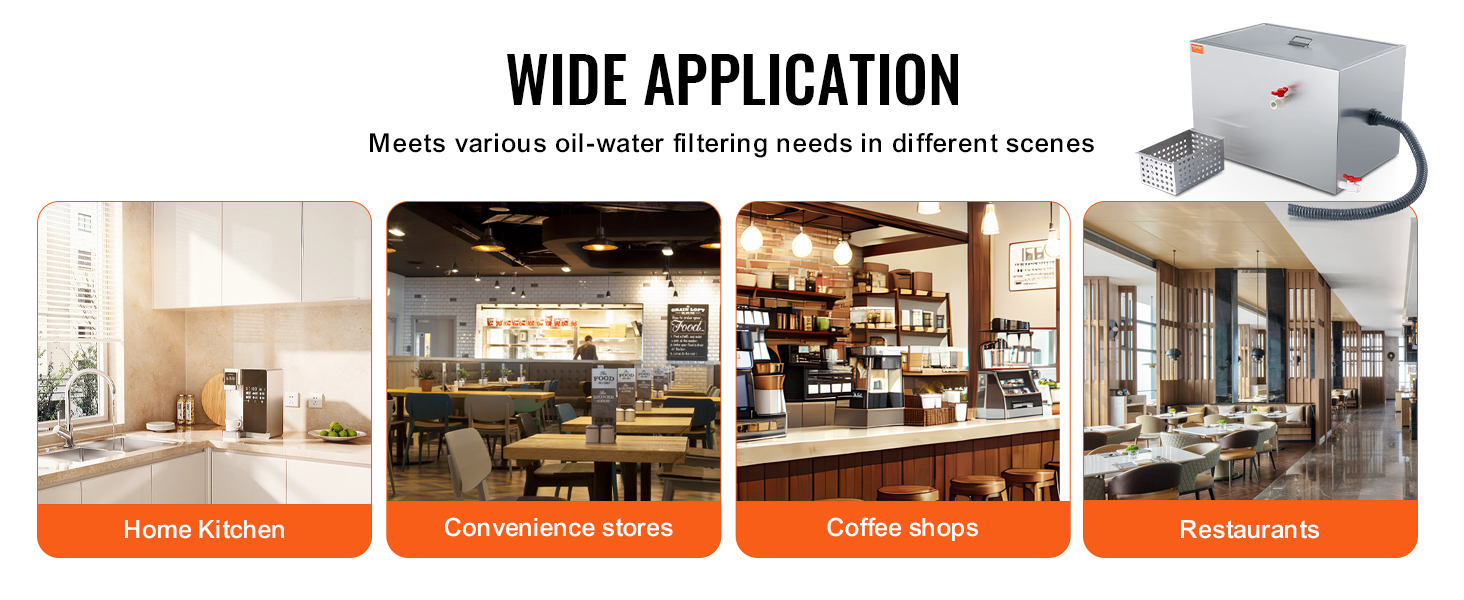Tento lapač tukov je vhodný na spracovanie minerálnych olejov, živočíšnych olejov, rastlinných olejov, zmiešaných olejov a rôznych emulgovaných olejov. Má vysoko účinný účinok oddeľovania oleja od vody a je ideálny pre kuchyne, reštaurácie, kaviarne, továrne, školy alebo malé drezy a umývačky riadu.