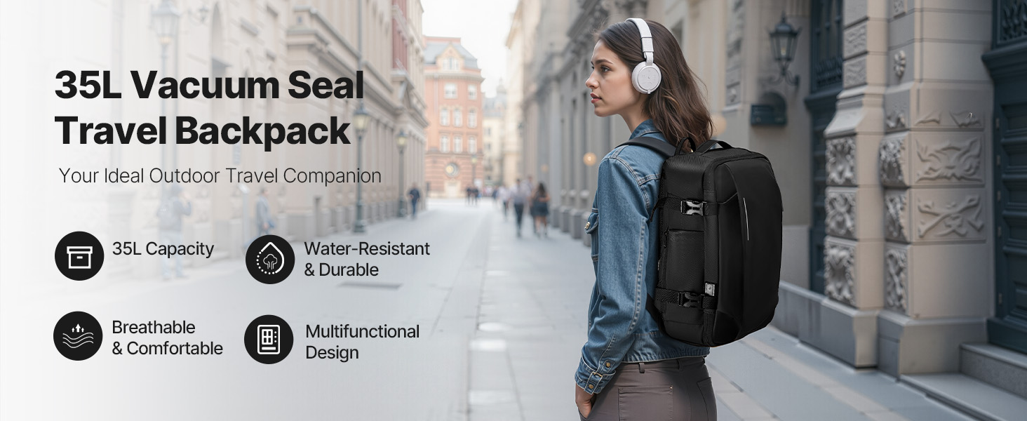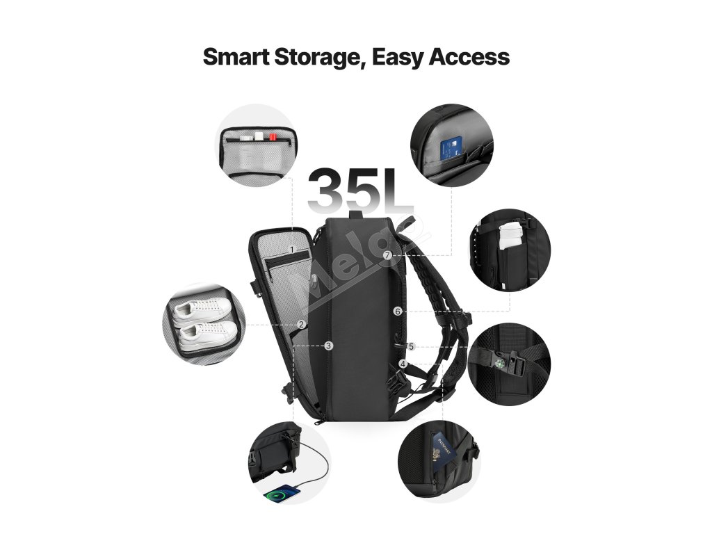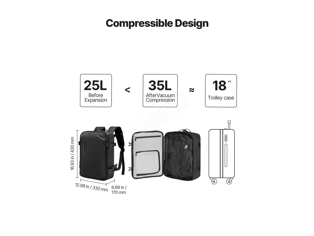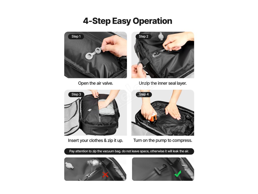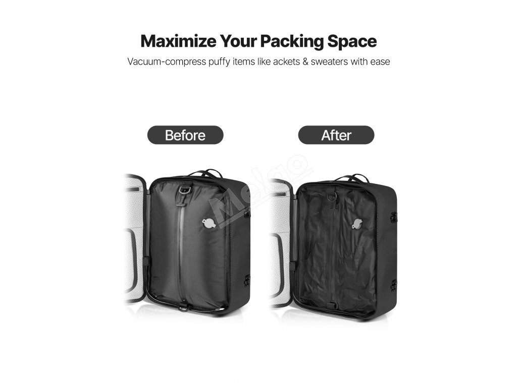 Cestovný batoh s vákuovým tesnením ľahko usporiada oblečenie, obuv, prípravky na starostlivosť o pleť, opaľovací krém, elektronické zariadenia a ďalšie predmety. Oddelenie mokrých a suchých vecí udržiava vaše veci čisté a upratané.