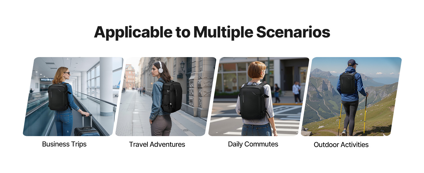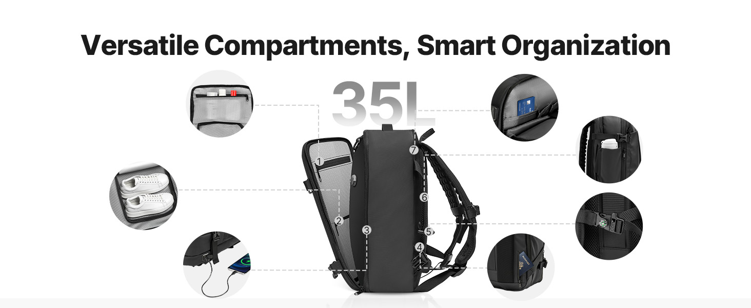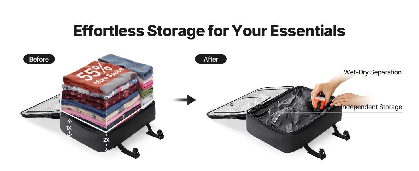 Dodáva sa s minivakuovou pumpou na kompresiu bez námahy. Je vybavený špecializovanými priehradkami a multifunkčnými vreckami, ako je oddelenie suchého a mokrého, izolované vrecko, vrecko proti krádeži, pojme vaše oblečenie a veci dennej potreby. Ideálny na dochádzanie do práce, kempovanie alebo služobné cesty.