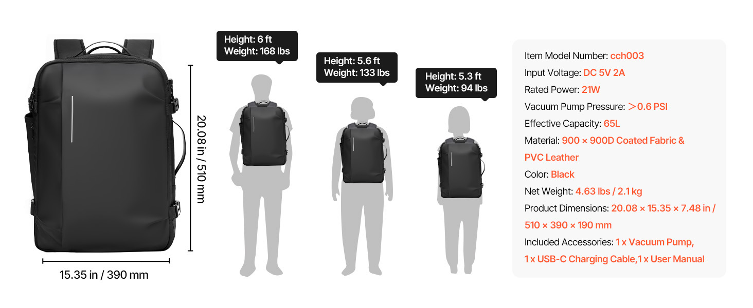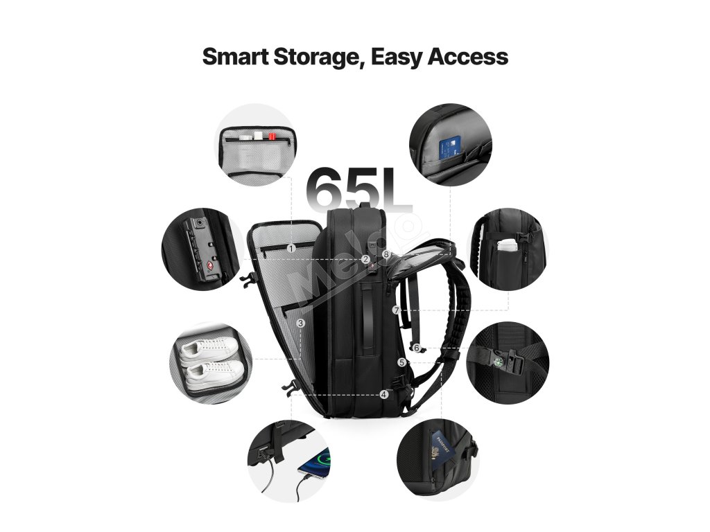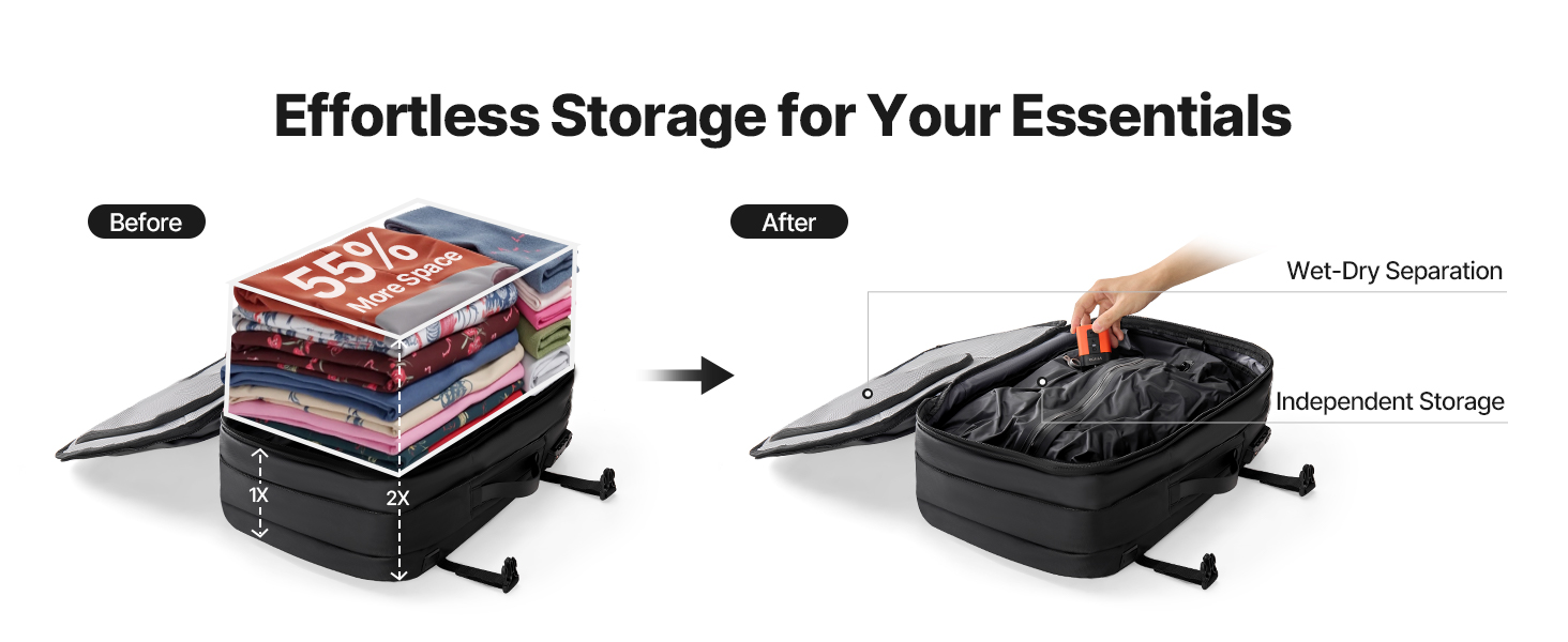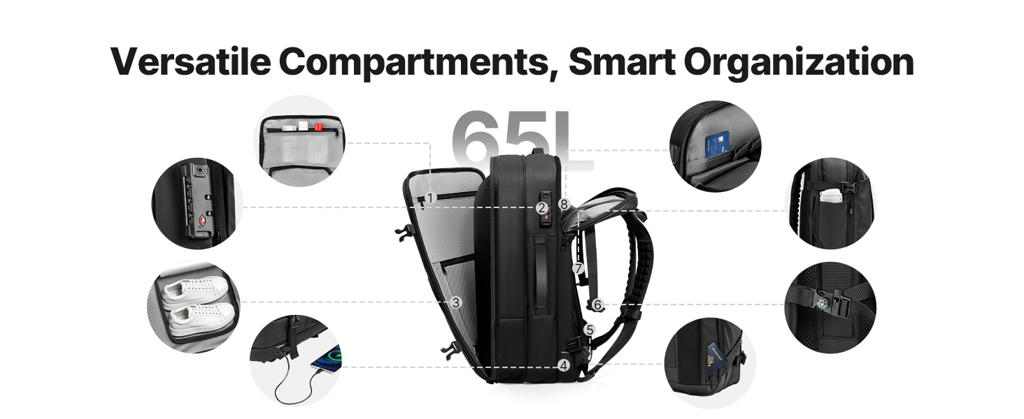 Dodáva sa s minivakuovou pumpou na kompresiu bez námahy. Tento batoh je vybavený špecializovanými priehradkami a multifunkčnými vreckami, ako je oddelenie suchého a mokrého, izolované vrecko, vrecko proti krádeži, a pojme vaše oblečenie a veci dennej potreby. Zámok so schválením TSA pre väčší pokoj v duši.