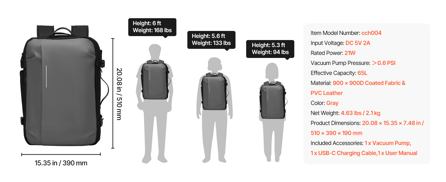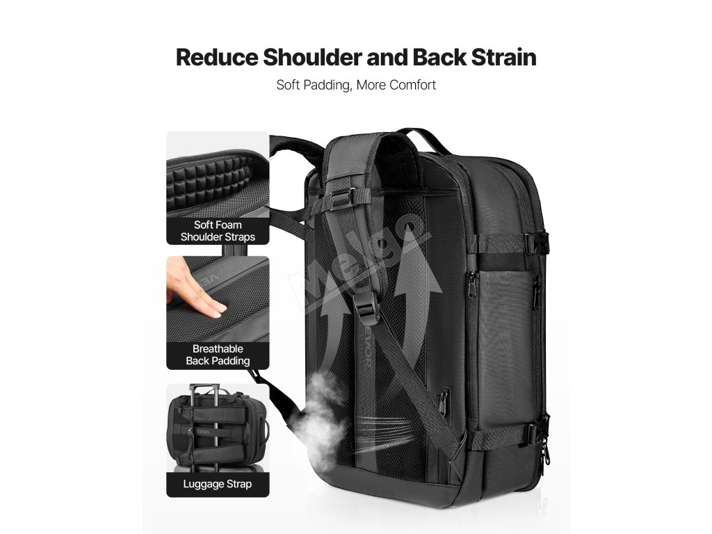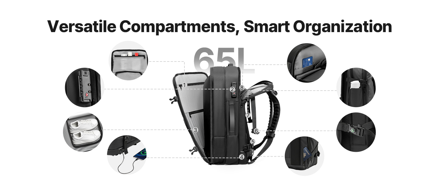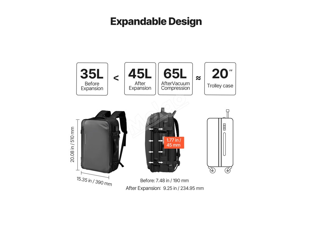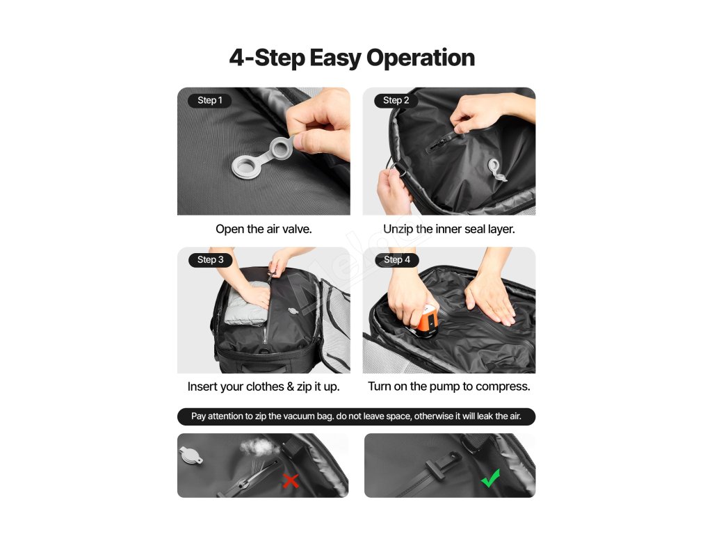 Dodáva sa s minivakuovou pumpou na kompresiu bez námahy. Tento batoh je vybavený špecializovanými priehradkami a multifunkčnými vreckami, ako je oddelenie suchého a mokrého, izolované vrecko, vrecko proti krádeži, a pojme vaše oblečenie a veci dennej potreby. Zámok so schválením TSA pre väčší pokoj v duši.