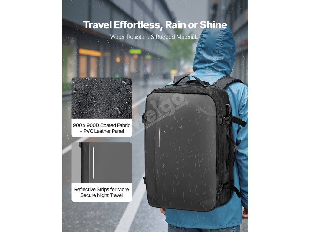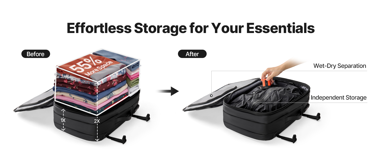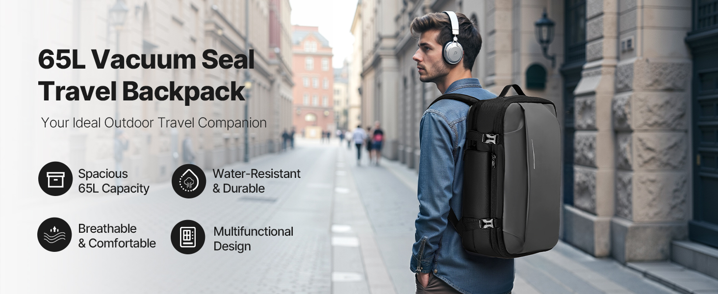 Cestovný batoh s vákuovým tesnením ľahko usporiada oblečenie, obuv, prípravky na starostlivosť o pleť, opaľovací krém, elektronické zariadenia a ďalšie predmety. Oddelenie mokrých a suchých vecí udržiava vaše veci čisté a upratané.