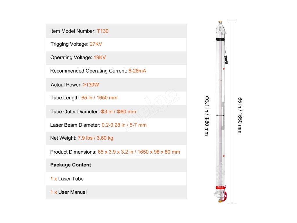 VEVOR 130W CO2 laserová trubica, dĺžka 65" (1650 mm)