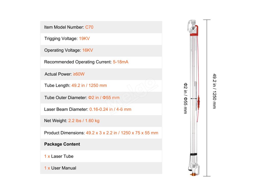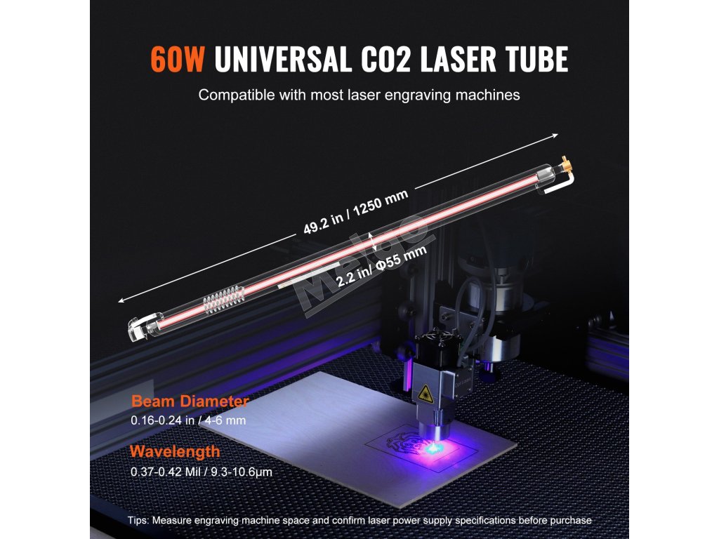VEVOR 60W CO2 laserová trubica, dĺžka 49,2" (1250 mm)