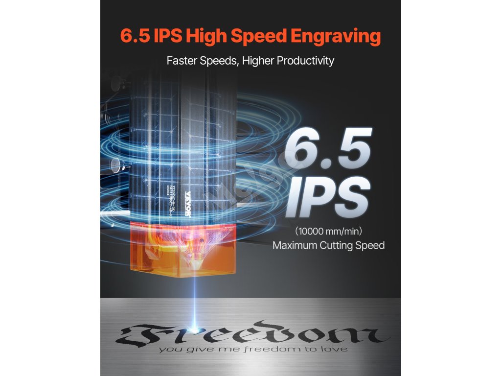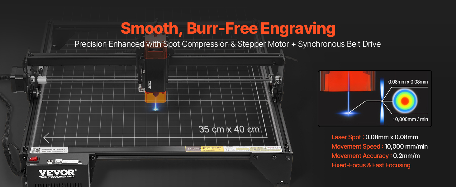 Vďaka stlačenému laserovému bodu 0,08 x 0,08 mm je energia koncentrovanejšia na jemnejšie a hladšie gravírovanie a rezanie. Krokový motor a synchrónny remeňový pohon umožňujú rýchlosť až 10 000 mm/min s presnosťou prenosu 0,2 mm/m, čo zaručuje výnimočné detaily gravírovania.