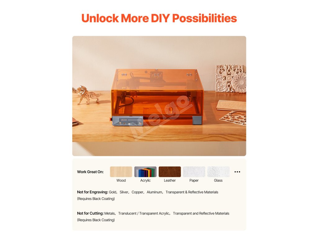 Popustite uzdu svojej kreativite vďaka pracovnej ploche 11,8 x 11,8 palca a rýchlosti gravírovania 7000 mm/min. Rezte na jeden priechod cez drevo basswood s hrúbkou 0,2 palca a dosiahnite jemné detaily pomocou modrého laserového bodu s rozmermi 0,10 x 0,12 mm. Vďaka konštrukcii laserovej triedy 1 podporuje aplikácie LaserGRBL, LightBurn (platené) a CutLabX APP.